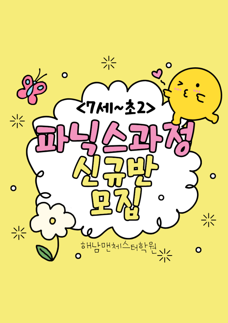 7세 ~ 초2 맨체스터 사운드 닥터(파닉스 과정) 신규반 모집합니다! 기존 반 졸업으로 새로운 1개 반을 신설합니다. 특허받은 영어 공부 방법, 사운드 닥터(Sound Doctor)는 아이들이 같은 시점에 함께 시작해야 학습 효과가 가장 높아 정원을 미리 모집합니다. 개강일 : 12월 1일(월) 정원 : 6명 (선착순) 현재 모집 인원 : 3명 사운드 닥터 파닉스는 기존 파닉스와 다릅니다 한 달 과정의 교재를 마치면, 그 알파벳이 포함된 단어는 모두 스스로 소리 내어 읽을 수 있게 됩니다. 일반 파닉스가 “외워서 읽기”라면, 사운드 닥터는 모르는 단어도 읽을 수 있는 진짜 파닉스입니다. 원어민 선생님이 정확한 발음을 직접....... <img src="https://blogthumb.pstatic.net/MjAyNTExMTlfMTA1/MDAxNzYzNTM0MzE1MTkw.fQlIw0R2WV5HEr78hkmO0NcgeiY4TMxcmyZFNlRq1OQg.NZRoQj7mUgswuj1M-gbArd33IkIVAOI8K_Ibq3jv2CAg.PNG/1.png?type=s3" />