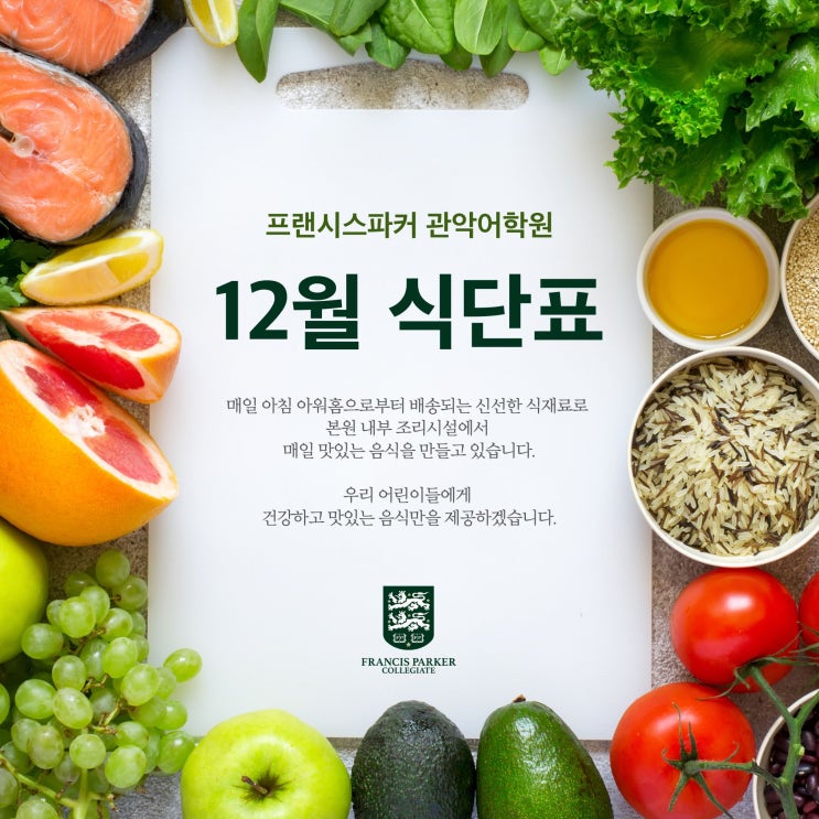 안녕하세요. 프랜시스파커 관악어학원입니다. 2025년 12월 식단표를 안내드립니다. 12월 영양 교육 안내 어린이들의 건강과 발육을 돕고 편식을 줄이고자 매월 실시하고 있는 영양교육입니다. 날짜: 12월 18일 목요일 12시 25분 주제: 바다의 보물 미역 활동내용: 미역을 효능을 알아보고 관찰해보고, 미끌미끌 물미역을 먹어보는 시간을 가져요! (교육연계메뉴: 물미역, 땅콩마요쌈장) 교육 진행: 김주희 영양사 선생님 아래는 아이들이 11월에 맛있게 먹은 점심과 스낵 사진입니다 #프랜시스파커관악어학원 #프랜시스파커관악 #관악구영어유치부 #관악구초등영어학원 #관악구중등영어학원 #관악구영어학원 #프랜시스파커관악초등....... <img src="https://blogthumb.pstatic.net/MjAyNTEyMDJfMTM2/MDAxNzY0NjIwODA5NzUz.tFATA2_M-ikImDltUIK1weI6wtwk7ycoqPXPm4rX50Ug.zNbMe5wVwH1FoIuU-nmnicFxX0eZ9R-QRs9neekjaxAg.JPEG/Happy_lunch_%283%29.jpg?type=s3" />