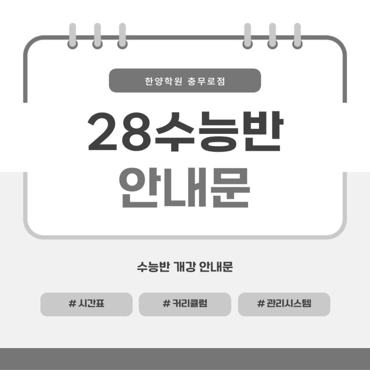 안녕하세요 한양학원 충무로점입니다. 2028학년도 수능을 준비하는 학생들을 위한 수능 대비반이 개강됩니다. 2028학년도 수능반 수능은 단기간 집중으로 완성되는 시험이 아닙니다! 기초 개념을 얼마나 탄탄하게 쌓느냐에 따라 결과가 달라집니다. 2028학년도 수능반은 수능 선행반으로 지금부터 차근차근 진행할 수 있습니다. 2022 개정 교육과정에서는 단순히 지식 암기 위주의 학습으로 좋은 결과를 내기 어렵습니다. 평가 방식과 과목 구조가 바뀐 만큼 맞춤형으로 장기적인 학습 관리가 필요합니다. 2028수능선행반 28수능 시간표 28수능 선행반은 소수 정예로 운영되어 학생 개개인의 수준과 목표에 맞춘 수강반으로 추천드립니다. 한양학....... <img src="https://blogthumb.pstatic.net/MjAyNjAzMjZfMTQx/MDAxNzc0NTA1MTQxNDY5.-vQdPzXlzRBxEOXdoE16F93t6JKoQDYtwM5f3V1KhPIg.WfBcf4-gi7W2xJyK2AcwEV2U6DeKnzfUr2WeFGKdysUg.JPEG/%C1%A6%B8%F1%C0%BB_%C0%D4%B7%C2%C7%D8%C1%D6%BC%BC%BF%E4._%2880%29.jpg?type=s3" />