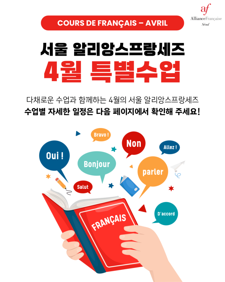 서울 알리앙스프랑세즈 4월 특별수업 프랑스어를 다채롭게 경험할 수 있는 특별수업! 본인의 레벨에서 원하는 테마의 수업을 선택하여 들어보세요. ▶5% 할인기간 : 3/23(월) - 3/28(토) ▶4월 수강기간 : 4/2(목) - 4/29(수) ——— ✅서울알리앙스프랑세즈 홈페이지 및 네이버 카페에서 24시간 온라인 등록 가능합니다. ✅문의사항은 ’서울 알리앙스프랑세즈‘ 카카오톡 채널 또는 02)755-4972로 문의주시기 바랍니다. ⬇4월 온라인 수강신청 바로가기 https://www.afseoul.or.kr/bbs/board.php?bo_table=yb_lecture01&wr_id=1 <img src="https://blogthumb.pstatic.net/MjAyNjAzMjZfMjUg/MDAxNzc0NTExNTYzMjk2.RDGniEgIpOY5aZaiCBHxCLnB7kAkHu4OUbsSV4Sdswsg.ylD_G4GVLO_bbEs7bBH9cCUTXj_tuCwtZN83ZAbYNDkg.PNG/KakaoTalk_20260326_165029546.png?type=s3" />
