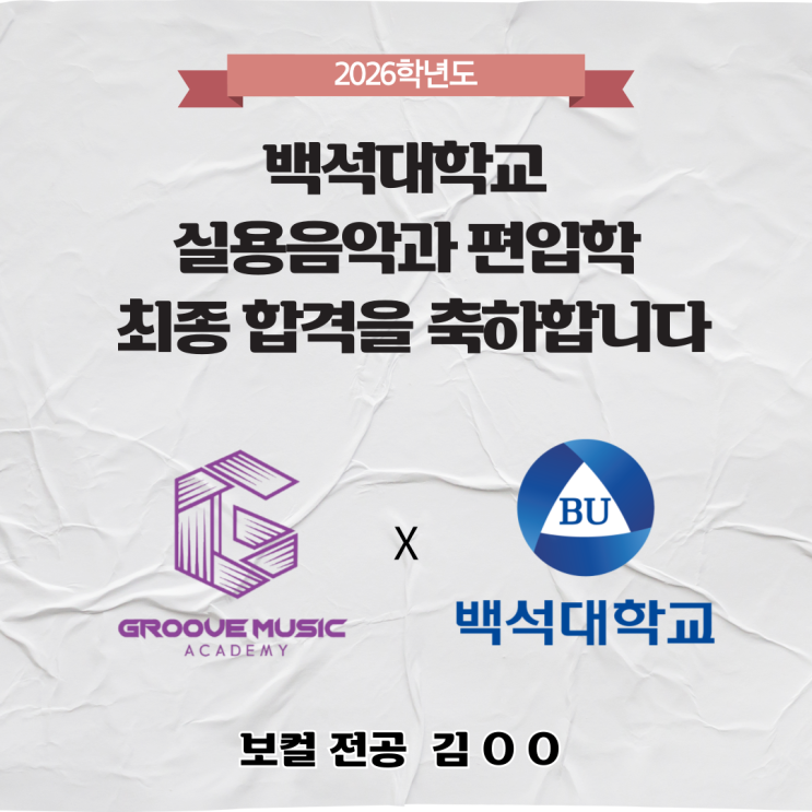 [경북/포항실용음악학원] 그루브 실용음악학원 2026학년도 "합격소식" 백석대학교 실용음악과 보컬 전공 편입 합격^^
