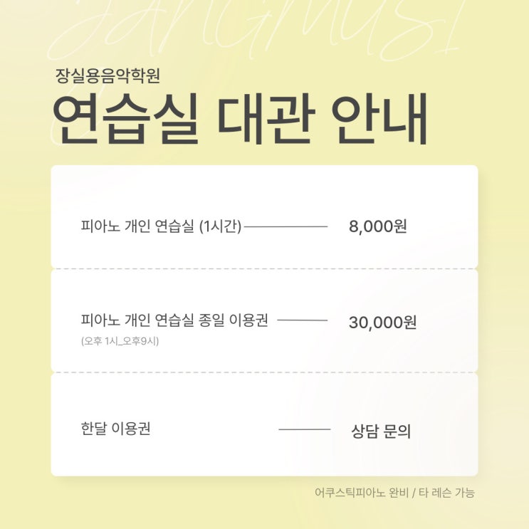 장실용음악학원 개인연습실 대관안내