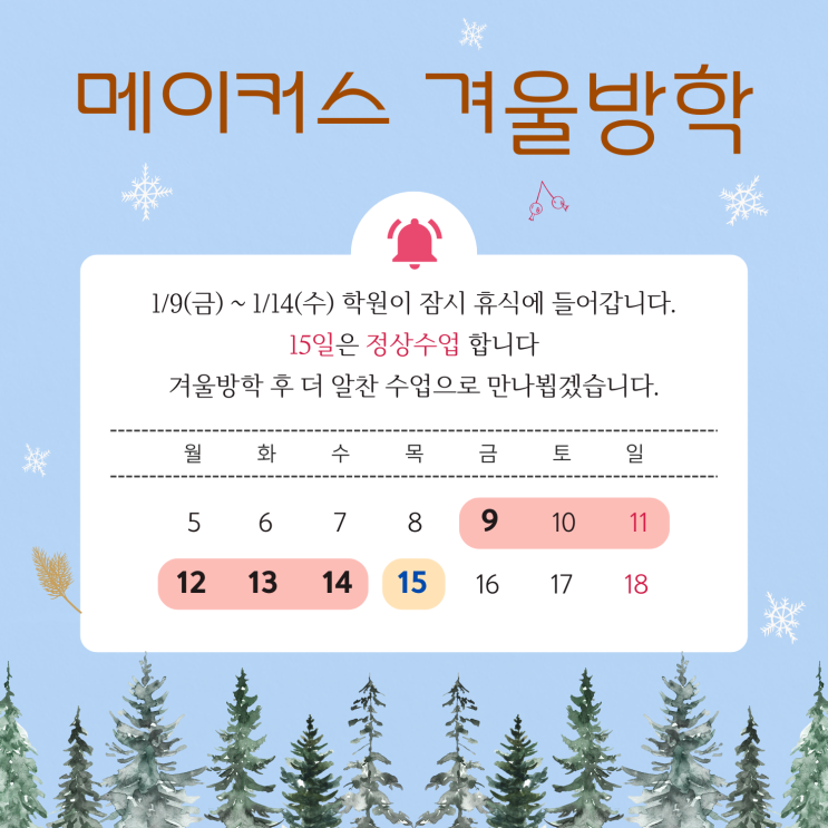 안녕하세요, 메이커스 겨울방학 일정 안내드립니다 기간은 아래와 같습니다♀️ ✔️1/9(금) ~ 1/14(수) ✔️9, 12, 13, 14일 / 총 4일 휴강 ✔️1/15(목)부터 정상 수업 ✅ 1월 8일까지는 기존 스케줄로 수업이 진행되며, ✅ 1월 15일부터는 변경된 스케줄로 수업이 진행될 예정입니다! 겨울방학 후 더 알찬 수업으로 만나뵙겠습니다. <img src="https://blogthumb.pstatic.net/MjAyNjAxMDNfNCAg/MDAxNzY3NDM4MDg1NDAy.9rvjqyk-CMDjL2wxW4faSd_M-UKnQ8Pcui9HauMYN34g.HBp3UUn_HVDr9sbcYLEJOFgLcHJ2FkLPCpbw12-PnE4g.PNG/%B8%DE%C0%CC%C4%BF%BD%BA_%B0%DC%BF%EF%B9%E6%C7%D0_%282%29.png?type=s3" />