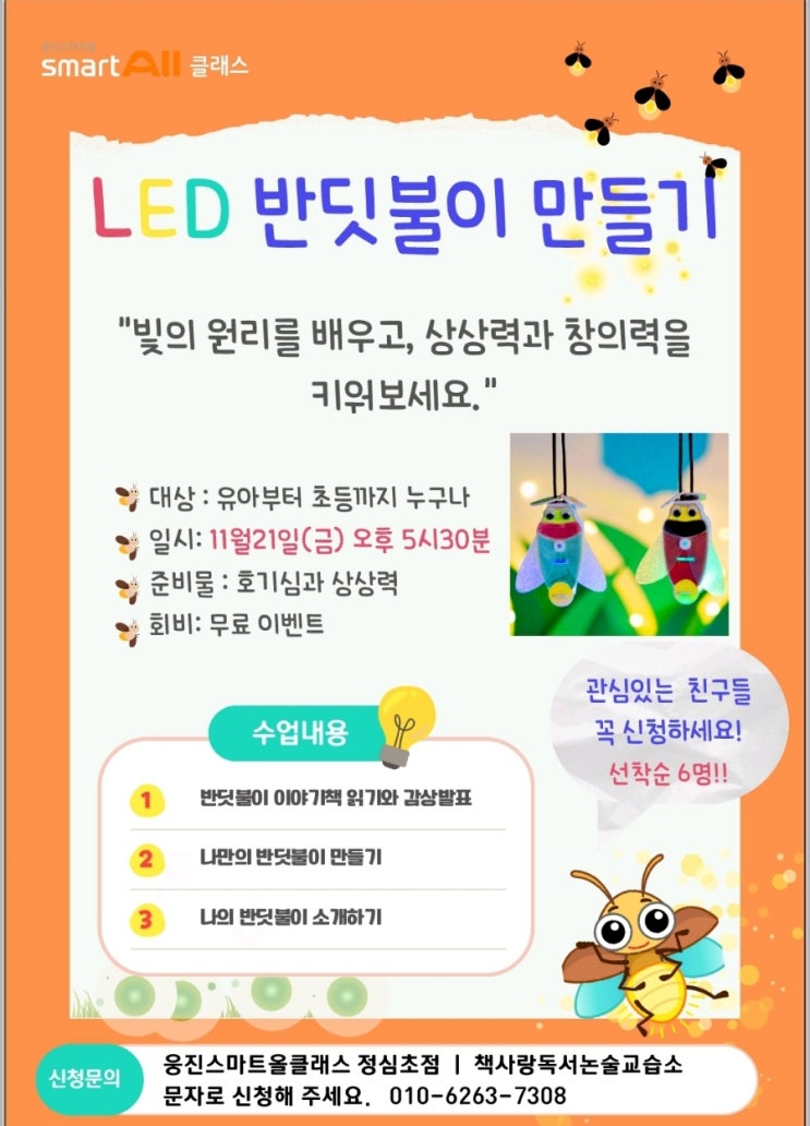 11월 2번째 행사 반딧불이 만들기 우린 책을 사랑하는 책사랑 클래스 그래서 함께 책을 읽고 활동지 작업하고 반딧불이도 직접 만들어보는 스토리가 있는 원데이클래스였습니 먼저 요렇게 준비하고~~ 빛은 어디에나 있어요 책을 미러링해서 함께 읽고 초롱초롱 또롱또롱 예쁜 모습이었습니다 활동지 통해 스스로 정리해보는 시간까지~~ 반짝반짝 빛나는 저마다의 반딧불이 자랑하고 경험해본 시간이었습니다 ~~ <img src="https://blogthumb.pstatic.net/MjAyNTExMjNfMTE4/MDAxNzYzODc1MDE1NTA2.0uplZv7YwNWgF-Vt0V85GNcg3n0GzH2O-0YScYU6w54g.2m8IOP3wG_lcd_7Bh9XWFwj4-WXdY6kScyeiRq7m4sAg.JPEG/900%A3%DFScreenshot%A3%DF20251123%A3%DF141350%A3%DFHancom_Office_Viewer.jpg?type=s3" />