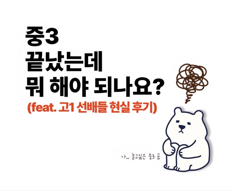중3 끝났는데 뭐 해야 되나요? (feat. 고1 선배들 현실 후기) 중학교 졸업하면 너무 후련하죠. “아 이제 좀 쉬자!” 하는 마음도 당연하고요. 근데… 고1 선배들에게 직접 물어보면 중3 겨울방학을 그냥 보낸 걸 정말 많이 후회합니다. 쌤이 실제로 우리 학원 고1 학생들 10명 넘게 인터뷰해봤는데, 하나같이 “선생님, 작년 겨울방학은 진짜 아깝게 날렸어요…” 라고 말하더라고요. 그래서 오늘은 "고1 선배들이 말한 ‘진짜 후회되는 TOP 5" 그리고 지금 무엇을 해야 할지 정확하게 알려드릴게요. 고1 선배들이 꼽은 후회 TOP 5 5위. 학원을 너무 늦게 알아본 것 2월 말에 학원을 알아보면 이미 자리가 없습니다. “급하....... <img src="https://blogthumb.pstatic.net/MjAyNTExMjlfMjAz/MDAxNzY0NDIxODI1NTEz.KfEAqR082lVzmMit1YLk3B2p_ga9Rb6EX1Gfsmkn8BQg.iq2OA8A4ypSXvidJQqLHrmS1MrvMPkGDsdKvwsX_pzEg.JPEG/KakaoTalk_20251129_220755132.jpg?type=s3" />