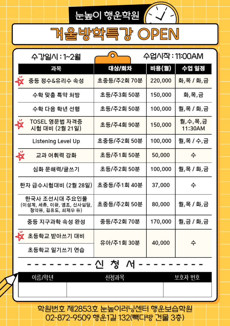 안녕하세요, 대교 눈높이 행운학원입니다. 1월과 2월 두달동안 진행되는 겨울방학특강 프로그램 12가지를 소개합니다. ✏️수학 중등 정수&유리수 속성반 수학 맞춤 특약 처방반 수학 다음 학년 선행반 ✏️영어 TOSEL 영문법 자격증 시험 대비반 (시험일 : 2월 21일) Listening Level Up Class ✏️국어 교과 어휘력 강화반 문해력/글쓰기 심화반 한자 급수시험 대비반 (시험일 : 2월 28일) ✏️유아 초등학교 받아쓰기 대비반 초등학교 일기쓰기 연습반 ✏️기타 한국사 조선시대 주요인물 개관반 중등 지구과학 파트 속성 완성반 자세한 내용은 02-872-9509로 문의해주시면 더욱 쉽게 설명드리도록 하겠습니다. 많은 신청 바랍니다 :) <img src="https://blogthumb.pstatic.net/MjAyNTEyMDNfNzYg/MDAxNzY0NzU2NjE3MTgz.DGxPiqj-r2yOi5LjbN1gaGj66FVefG_MOxb8u93IW0Ag.Fpx8mZ5SeXGhDusZ41j9-kHi90w_Lq_UP7goKyttBysg.PNG/2025_%B0%DC%BF%EF%B9%E6%C7%D0_%C6%AF%B0%AD_%BE%C8%B3%BB%B9%AE.png?type=s3" />