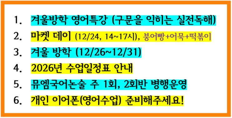 안녕하세요~ 날씨가 갑가지 추워졌네요 부랴 부랴 두꺼운 옷들을 챙겨 입었습니다. 이번 12월 소식은 조금 많습니다. 끝까지 잘 읽어주세요~ <겨울방학 특강> "구문으로 익히는 실전 독해" - 기간: 1월 5일~28일 - 요일: 월,화,수,목 (주 4회, 총 15회) - 특강시간: 4시~5시 <마켓데이 12/24> 작년 마켓데이 기억하시나요? 뮤엠 삼합!(붕어빵, 어묵, 떡볶이)으로 아이들과 즐거운 시간을 보냈었는데요 올해도 어김없이 진행됩니다. # 운영시간: 2시~5시까지 달러를 미리 가방에 챙겨주세요! https://blog.naver.com/life_edu/223714126021 <2025년 겨울방학> 12/26~31일까지 겨울방학에 들어갑니다. 1월 2일에 만나....... <img src="https://blogthumb.pstatic.net/MjAyNTEyMDRfNDIg/MDAxNzY0ODQyNDk1MTM1.ukCqAO0fZFvOJg18_yZMFvs92fUpkkyH-N31LnT4y1Eg.sEW1DOQ0afTLQQiwz_5BOV1yHMl-QiFUnO9EPm6iTAMg.PNG/image.png?type=s3" />