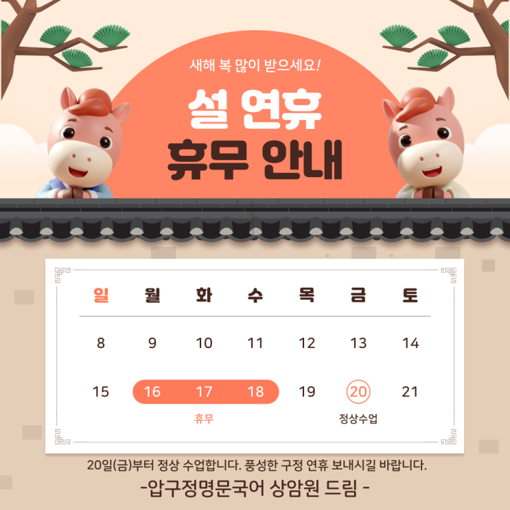 * 2월 15일 (일) 정상 수업 합니다. * 휴무 기간: 16일(월) ~ 18일(수) * 휴무 기간 동안의 수업은 추후 보강 예정 새해 복 많이 받으시길 바라겠습니다^^ <img src="https://blogthumb.pstatic.net/MjAyNjAyMTNfMTI1/MDAxNzcwOTY0ODM4NDA3.a8XrEmCqEX9yOCwa3ot3Mh6S8Oo49Q8nMG6CmrjKdAog.Lw5Em0Ow8Tvtq7rBRFXudDYTcM6ii2lfIKsyX5_b1M8g.PNG/26%B3%E2_%BC%B3_%BF%AC%C8%DE_%C8%DE%B9%AB.png?type=s3" />