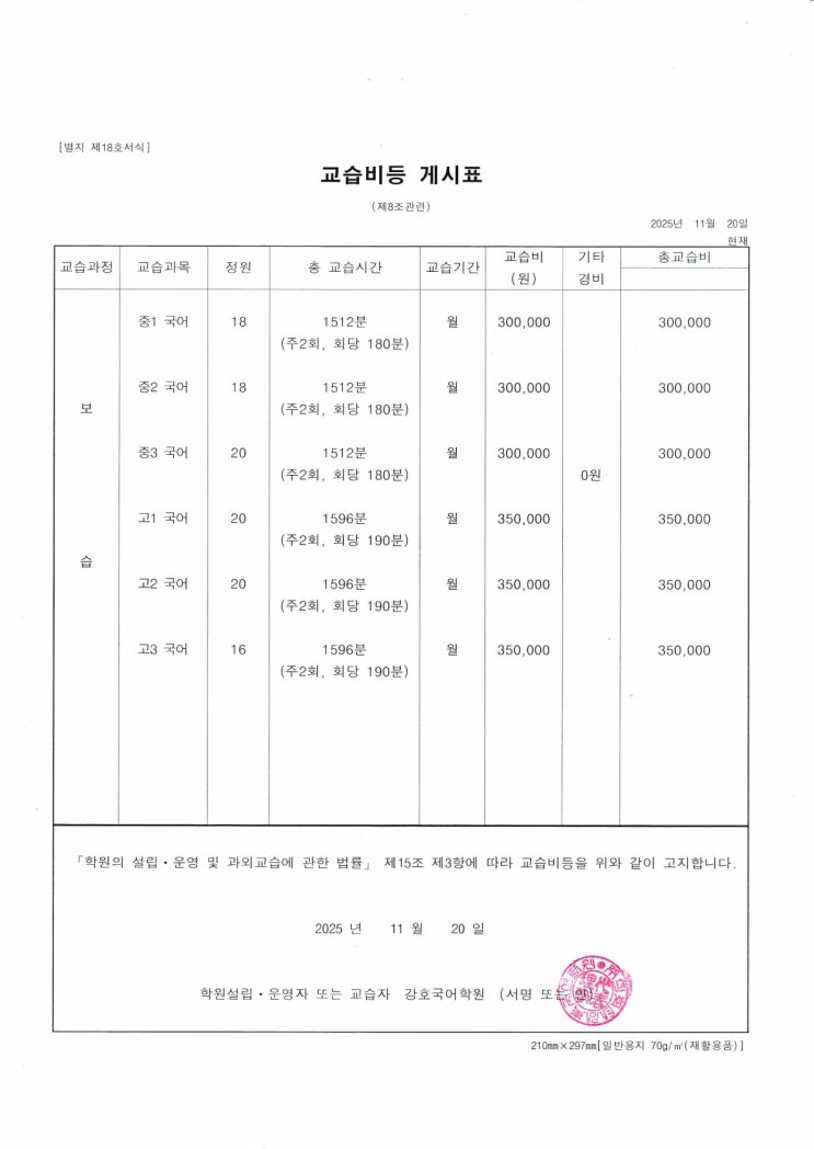 강호국어학원 : 교습비 안내