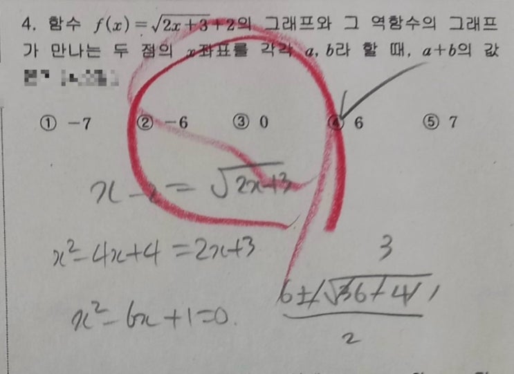 역함수와의 교점이 하나뿐인데 ‘서로 다른 두 점’이라고 제시한 문제 기말고사 문제들을 정리하다가 대암고, 창원남고 에서 두 학교가 출제오류를 한 것을 발견했습니다. 함수 f(x)와 그 역함수 의 교점을 구하는 문항인데, 문제에서는 “서로 다른 두 점 A, B에서 만난다”고 전제하고 있습니다. 하지만 실제로 그래프를 분석해보면, 이 두 그래프는 교점이 단 하나만 존재합니다. 따라서 문제의 전제가 사실과 다르므로 출제 자체에 오류가 있다고 볼 수 있습니다. ⸻ 하지만 x≥2 조건으로 x=1은 탈락(허근). 따라서 교점은 오직 x=5 하나만 존재한다. 즉, 교점은 단 하나. 검토없이 숫자만 억지로 넣으면서 문제 구조가 성립하지....... <img src="https://blogthumb.pstatic.net/MjAyNTEyMDdfMjk0/MDAxNzY1MDgxODY1MzIw.5GGONVaOvpWrwZy1Dw8eG9_X_DxOFHy84haK_p8fKG4g.zB1sIJurQZHkFIUGf-rlx9JCnd8HPLR7872cBXenjrcg.JPEG/output%A3%DF718588340.jpg?type=s3" />