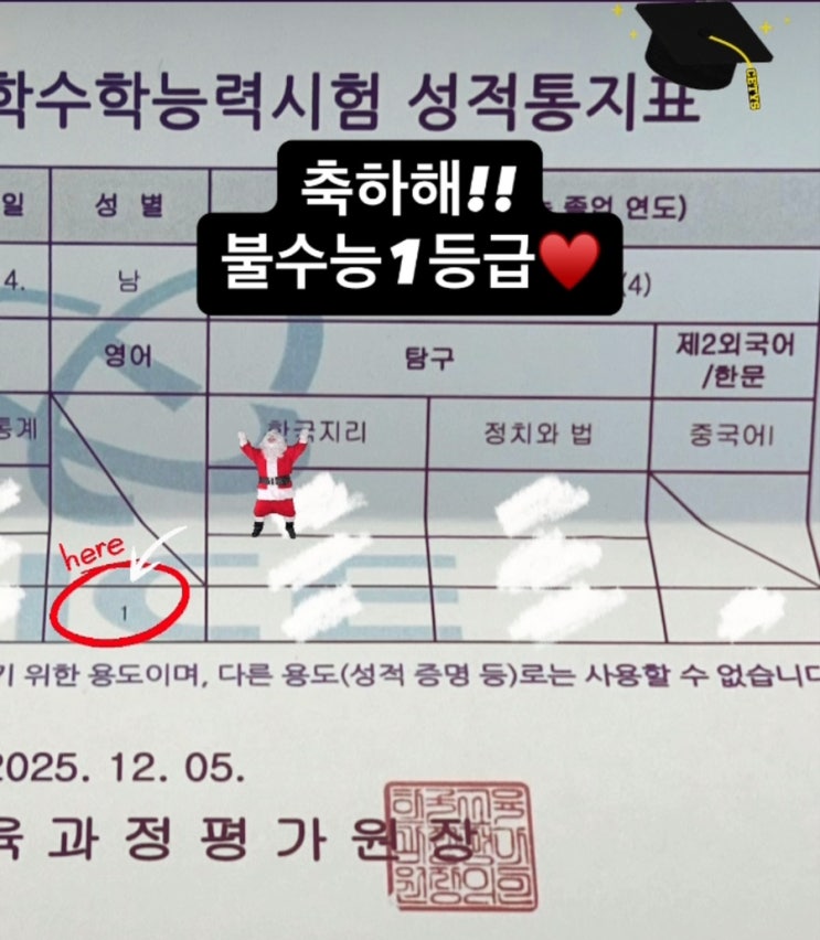 대단해!!!! 3프로만 1등급이라던데 1등급을 따냈구나~ 성적표 나왔다고 바로 사진보내주는 센스❤️ 정말정말 축하한다. 그나저나 수능출제위원분덜.. 증말 난이도조절 어찌되신걸까요?? 못받은 친구들 좌절하는 친구들 걱정이 또 됩니다..ㅠㅠ 힘내라 이세상 고3들아!! <img src="https://blogthumb.pstatic.net/MjAyNTEyMDlfNzkg/MDAxNzY1MjU3NjMwOTMz.d3J0gJ3X7hSB6xk_ALJlUdRMTKZJIOlia50hKgLwOCsg.HUhqXXufg5KaBiGCvnHuX-mK_ddy2VKpMXuOzdQxgAgg.JPEG/IMG_9697.jpg?type=s3" />