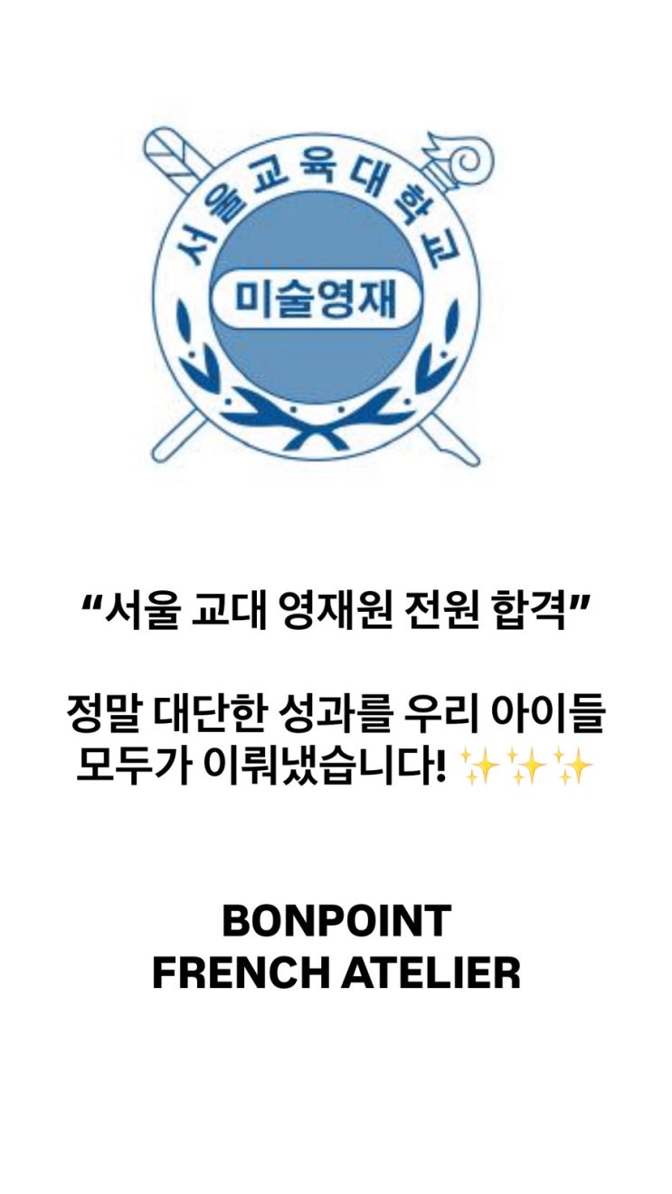 잊지 못할 아이 기억에 남을 인생의 한 페이지를 기록하듯, 봉프앙 프렌치 아틀리에는 다시 한번 독보적인 순간을 만들어냈습니다. 지원한 모든 아이들이 서울 교대 미술 영재원과 전통문화 재단 영재원에 당당히 합격한 것은 단지 결과가 아니라, 우리가 만들어가는 하나의 의미 있는 또 다름을 인정받는 순간들입니다. 무더운 여름의 시작부터 추워진 마지막 2차 시험일까지, 우리는 예술이라는 이름 아래 끊임없이 나아갔고, 그 여정은 그 자체로 예술가들이 담아내는 컬렉션처럼 다채롭고 유니크했습니다. 정해진 인원을 선발하는 시험이라 2차까지 합격하기는 정말 쉽지 않다는 걸 다 알고 계시겠지만, 6월부터 시작된 이 짧은 여정 동안, 아....... <img src="https://blogthumb.pstatic.net/MjAyNTEyMDVfMjcz/MDAxNzY0OTE4OTIzNzUx.oSlY6WLAaXQ2L0p_rzl6lwcUAIAePcbGAzd1nzOU458g.liKUiNBUkHlStYjI5gcvO-gR5f0h7MmUS7L6-J4mV2Ag.JPEG/25435E9A%A3%ADB568%A3%AD4BC5%A3%ADAFD5%A3%AD3BD0C1CB6521.jpg?type=s3" />