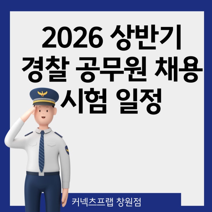 안녕하세요 커넥츠프랩 창원점입니다. 오늘은 많은분들이 기다리셨던 2026 상반기 경찰 공무원 채용 시험 일정 공고에 대해 알려 드리도록 하겠습니다. 상반기 필기 시험은 내년 3월 14일 토요일에 진행 될 예정입니다. 상기 채용 일정은 시험 관리 사정 등에 따라 변경 될 수 있으므로 시험과 관련된 모든 사항은 경찰청 인터넷 원서 접수 사이트에서 반드시 확인 부탁드립니다. 2025 올 한해도 얼마 남지 않았습니다. 시험일까지 94일 남았으니 지치지 말고 꾸준히 열공하셔서 원하는 결과 꼭 얻으시길 바라겠습니다. 원활한 상담을 위해 예약 후 방문 상담 부탁드리며, 방문이 어려우실땐 네이버 톡톡으로 문의 가능합니다. ☎055-262-0099 ☏....... <img src="https://blogthumb.pstatic.net/MjAyNTEyMTBfMTY3/MDAxNzY1MzU1NzY0NzQ1.15jYRClsgODlKnw5m4-FQNSXpHjHNQuHBZa6nahkR9Qg.pmBK3pml9qetiTBFK_81ZFH60YC7i4GUiozlySOP760g.JPEG/%C1%A6%B8%F1%C0%BB-%C0%D4%B7%C2%C7%D8%C1%D6%BC%BC%BF%E4_-001.jpg?type=s3" />