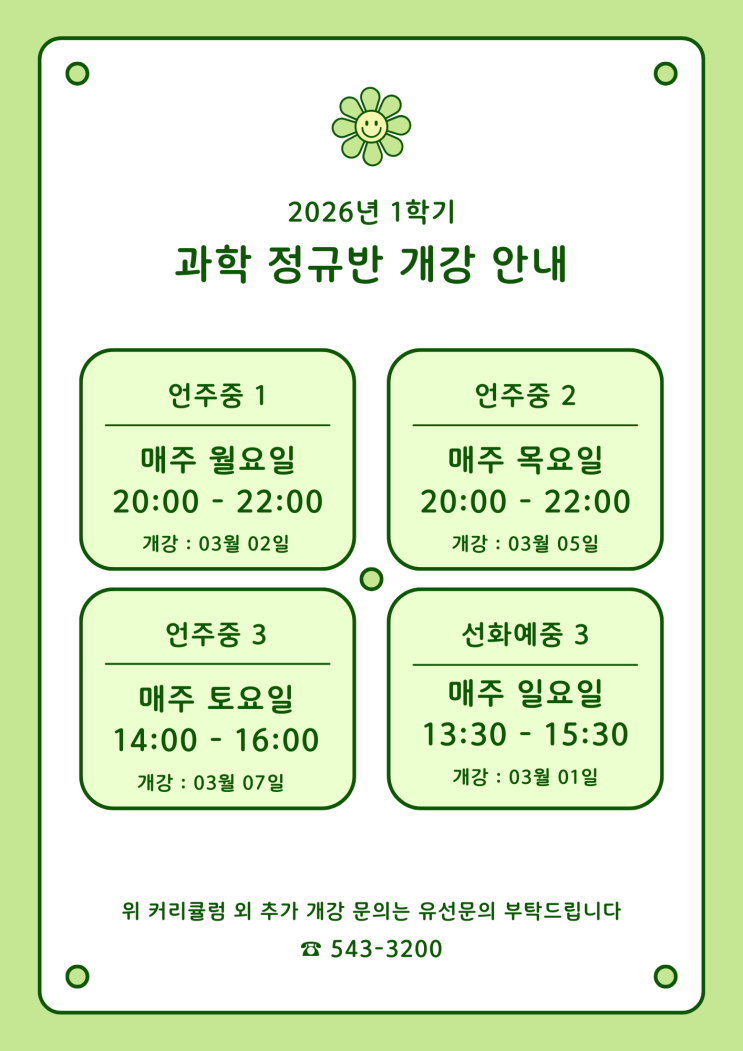 통합과학 / 내신 물리 / 내신 화학 / 내신 생명과학 / 내신 지구과학 ----------------------------------------------- -강의 특징- 개인별 맞춤 밀착 케어 시스템 단순한 지식 전달을 넘어, 학생의 현재 위치에 맞춘 최적의 학습 솔루션을 제공합니다. 1:1 밀착 강의: 학생의 이해도에 맞춘 100% 개인 맞춤형 수업을 진행합니다. 강의 + 개인 클리닉: 수업 후 , 즉각적인 질의응답과 취약점 보완 클리닉이 병행됩니다. 복습 & 응용 훈련: 배운 내용을 완전히 내 것으로 만드는 완벽한 복습 과정과 심화 응용 문제 풀이 훈련을 제공합니다. 내가 하는 일이 옳은 것이라면 설사 세상이 나를 돕지 않아도 하늘이 나를 돕는다. <img src="https://blogthumb.pstatic.net/MjAyNjAyMjZfNTUg/MDAxNzcyMTA4NDg1NjM1.LPe8fxZdLflkWktdlwyYa7bRkFSqXjIFPHgFSR5DU_Ag.mb09EToZVvN04rF0zv3KHyn4V-2o4k76zDvLgLpTJpUg.PNG/01.png?type=s3" />