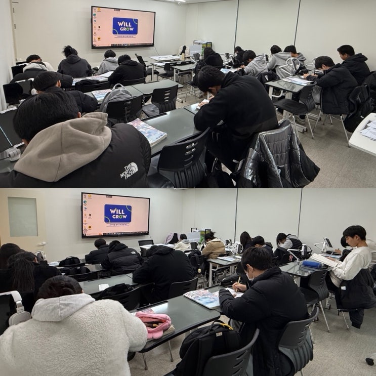 지난주 토요일을 마지막으로 올해 주말 보강이 모두 완료되었습니다. 초전동 초,중,고등 영어전문 WILL 입시영어 전문학원 주말보강엔 특별한 점이 있습니다. 바로 3가지가 없다는 것인데요. WILL 입시영어 전문학원 시험대비 주말 보강에 없는 3가지에 대해 이야기 해 보겠습니다. 첫번째, 수업이 없습니다. 주말보강이 있는 날이면 아무리 시간 잘 지켜 등원해라, 지각하지 말아라. 당부를 해도 대부분의 아이들은 허겁저겁 등원합니다. 약간은 얼이 빠진 표정으로요. 주말을 앞둔 해방감에 풀어져 밤 늦도록 휴대폰을 하거나, 게임을 했다는 아이들이 많아요. 감은 머리도 다 말리지 못하고 선생님께 야단이라도 들을세라 서둘러 등원했던 아....... <img src="https://blogthumb.pstatic.net/MjAyNTEyMDlfMjc0/MDAxNzY1Mjg2MTA5ODMw.fVTlGHoCBzOv_wgx_fIwweszBJQQJ2pztQgu0JCkCSUg.sQyPCouGgB8jo5aBQd8oiWkhgV-LpBscl0jg6wLLyAMg.JPEG/IMG%A3%DF0153.JPG?type=s3" />