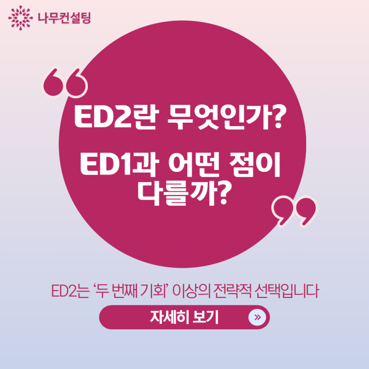 안녕하세요. 미국 명문 대학 입시 컨설팅 전문 나무컨설팅입니다. 많은 학생들이 Early Decision(ED)을 “가장 확실하게 붙을 수 있는 길”이라고 생각하지만, ED 안에서도 ED1과 ED2는 전략적으로 완전히 다른 기회입니다. ED1 결과가 발표된 직후, 갑자기 주변에서 “ED2 넣어볼까?”라는 말이 들리기 시작하면서 학생도, 학부모도 혼란스러워지죠. 과연 ED2는 누구에게 유리한 전형일까요? 또 ED1과는 정확히 무엇이 다를까요? 이번 글에서 그 모든 것을 깔끔하게 정리해 드립니다. ED2란 무엇인가? ED2(Early Decision II)는 말 그대로 두 번째 조기전형입니다. ED1과 동일하게 합격 시 등록이 의무적인 Binding 제도입니다 일반전형(RD)보다....... <img src="https://blogthumb.pstatic.net/MjAyNTEyMDlfNiAg/MDAxNzY1MjQ4NjkyODI4.2CzDvYTBnxAJpi8OdTk_KG15D8agQKBgP_OD57Nkh20g.J0WOMG-a6KI07lGj32v_OF6uf0uYMSQCMoAC-YRDrvEg.PNG/ED2%B6%F5_%B9%AB%BE%F9%C0%CE%B0%A1__ED1%B0%FA_%BE%EE%B6%B2_%C1%A1%C0%CC_%B4%D9%B8%A6%B1%EE__%281%29.png?type=s3" />