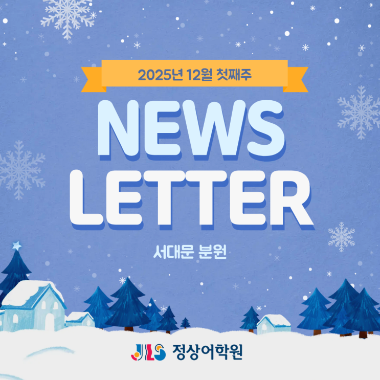 안녕하세요. 서대문 정상어학원 입니다. 12월 첫째 주 뉴스레터 소식입니다. 다음 주는 2026년 새 학기가 시작됩니다. 올해의 남은 12월 한 달 즐겁고, 행복한 마음으로 보내 보아요:) <img src="https://blogthumb.pstatic.net/MjAyNTExMjhfMjQ4/MDAxNzY0MzI1NjcxMDcw.QTisb4YaLunmTpk8YxGO7U4UByIJBh63_GMkO9dCdK4g.EnKWfjgipZSRnl-q5OQTN_glcR-WWRbPDg-AZTOnr4Eg.PNG/1.png?type=s3" />