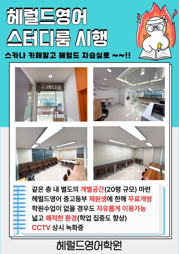 안녕하세요 헤럴드영어학원입니다. 이번에 이전을 하면서 신경 썼던 부분 중에 하나가 바로 중 고등부 스터디룸입니다. 학생들이 학원 시간이 중간에 남아서 시간이 어중간하거나, 스터디 카페나 카페를 가는 모습을 그동안 많이 봐왔습니다. 우리 아이들의 시간과 비용을 아껴주기 위해서 헤럴드영어 전용 스터디룸을 오픈했습니다. 학원과 출입문도 별도인 공간으로 구성되어 학생들이 수업과 상관없이 자유롭게 다닐 수 있도록 약 20평 규모의 스터디 룸으로 꾸몄습니다. 다양한 형태의 책상(칸막이, 넓은 책상, 그룹 책상)들로 이루어져 취향에 맞게 집중도를 높일 수 있게 했고, 작은 로비를 만들어 공부하다가 잠깐 쉴 수 있는 공간도 마련....... <img src="https://blogthumb.pstatic.net/MjAyNTEyMDJfNzQg/MDAxNzY0NjcxNDMyODc1.JC8Y-PN8JjfIWAZVb1ljLZBBGOqEfJVpbXEaYmh68ZIg.qfIwueluewRhUa24uxHhBUllA3iS3kn9m42XkDN6yvog.JPEG/KakaoTalk_20251130_132124457_01.jpg?type=s3" />