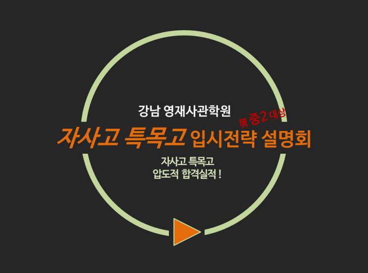 자사고 특목고 입시 전문 학원 강남 영재사관학원입니다. 현 중2(예비 중3) 학부모님 대상의 자사고 특목고 입시전략 설명회가 12월27일(토) 오후 3시에 진행됩니다. 설명회 예약 방법 및 구체적인 일정은 아래 쪽을 확인해주세요. 이번 자사고 특목고 입시 전략 설명회는 현재 중2(예비 중3) 학부모님 대상으로 진행되며 저학년이 설명회에 참석할 경우, 추후 진행되는 학원 설명회는 참석이 불가능합니다. 외대부고, 하나고, 민사고, 상산고 등 전국 단위 자사고와 대원, 한영, 명덕, 대일 등 서울권 외고 서울국제고를 포함한 국제고에 대한 설명이 주요 내용입니다. 설명회 내용 올해 자사고 특목고 입시 분석 학교별 자기소개서 및 면접 학....... <img src="https://blogthumb.pstatic.net/MjAyNTEyMDhfMjkg/MDAxNzY1MTc2NjE0NjY4.DDLwUxgD1bO6rTT86kmEL7RKR4HrbgWs6KE0siHo7yog.TsDSACcjZR3qAmfc_86zZVYrh6050keah7B02DIWv3sg.PNG/image.png?type=s3" />