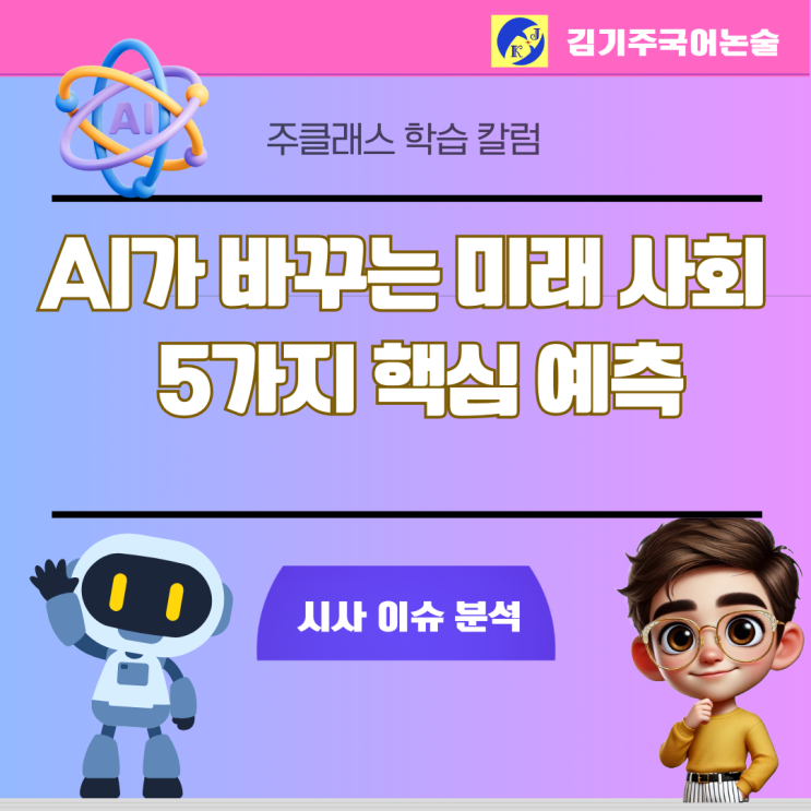 안녕하세요, 김기주 국어 주클래스입니다. 급변하는 기술의 흐름 속에서 우리 아이들이 마주할 미래는 어떤 모습일까요? 최근 일론 머스크의 인터뷰는 단순한 기술적 전망을 넘어, 우리가 당연하게 여겼던 교육, 직업, 그리고 경제 구조의 근간을 뒤흔드는 충격적인 내용을 담고 있습니다. 오늘은 수능 국어 및 내신 비문학 독서의 단골 소재인 '기술과 사회의 변화', 'AI 윤리 및 경제 체제'의 배경지식으로 활용하기 좋은 일론 머스크의 AI 미래 예측을 간략하게 체계적으로 정리해 드립니다. 1. 지능의 역전 : 2030년 인류 전체 지능을 넘어서는 AI 머스크는 2030년경 AI의 지능이 80억 인류 전체의 지능을 합친 것보다 뛰....... <img src="https://blogthumb.pstatic.net/MjAyNjAyMjdfMjU0/MDAxNzcyMTUxOTI3ODA0.8-gg_3cKE5c4XFwEwXeGAgvoZRlqvgZtpqp8YBS8CZAg.T23CzVbncVd5_gy93aL28hIVulzjle8i9elkPZKvAmEg.PNG/%C6%C4%B6%F5%BB%F6%B0%FA_%C8%B8%BB%F6_%BD%C9%C7%C3%C7%CF%B0%ED_%B1%F2%B2%FB%C7%D1_%BA%F1%C1%EE%B4%CF%BD%BA_%C4%AB%B5%E5%B4%BA%BD%BA_%C0%DB%BC%BA_%BF%E4%B7%C9_%BE%C8%B3%BB_%B5%F0%C0%DA%C0%CE_%C5%DB%C7%C3%B8%B4_%C0%CE%BD%BA%C5%B8%B1%D7%B7%A5_%C6%F7%BD%BA%C6%AE%C0%C7_%BB%E7%BA%BB_%2823%29.png?type=s3" />