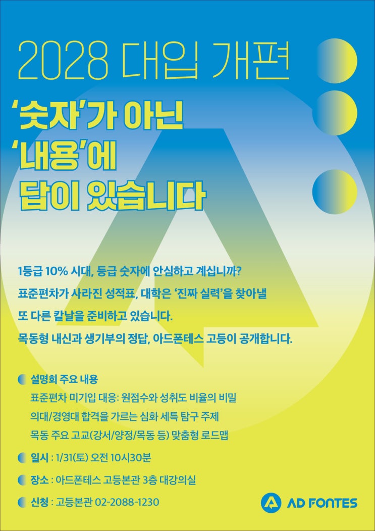 2028 대입 개편, '숫자'가 아닌 '내용'에 답이 있습니다. 1등급 10% 시대, 등급 숫자에 안심하고 계십니까? 표준편차가 사라진 성적표, 대학은 '진짜 실력'을 찾아낼 또 다른 칼날을 준비하고 있습니다. 목동형 내신과 생기부의 정답, 아드폰테스 고등이 공개합니다. 설명회 주요 내용 - 표준편차 미기입 대응: 원점수와 성취도 비율의 비밀 - 의대/경영대 합격을 가르는 심화 세특 탐구 주제 - 목동 주요 고교(강서/양정/목동 등) 맞춤형 로드맵 일시: 1/31(토) 오전 10시30분 장소: 고등본관 3층 대강의실 대상: 예비고1,2 학부모님 ※ 조기 마감시 비예약자 입장 불가 ※ 건물주차 불가로 대중교통 이....... <img src="https://blogthumb.pstatic.net/MjAyNjAxMjJfMjcx/MDAxNzY5MDc3NTk1MjU4.nGhVCtR2yal8kUfb2Mxht0vBIYxtbpByDjeZ-geAg3Yg.eA_RQ-e7gAeW-xPVlqXQfZobixsXlo5oCBk-3r7_LEEg.JPEG/%BF%B9%BA%F1%B0%ED1%2C2_%BC%B3%B8%ED%C8%B8.jpg?type=s3" />