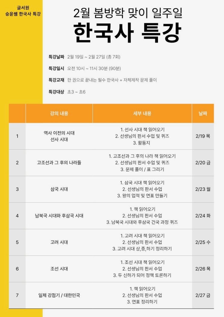 안녕하세요~ 봄방학을 맞아 글서원 봄 특강이 새롭게 열립니다! ***신청 및 문의사항은 010- 8602-6076 금일 오후 5시 30분부터 선착순 마감입니다!! <일주일 한국사 특강> <토론 특강> <봄방학 필독서 특강> <사자성어 특강_8회반> <토론 특강_8회반> <사자성어 특강_화목토 7회반> <img src="https://blogthumb.pstatic.net/MjAyNjAxMjhfMTgz/MDAxNzY5NTgxNTc0Njk5._5b7x0lHnAxkpDnK30cRJq1zYQFB2gJkUEOp7xgR9tsg.yamcsxXx6iTtXN4ydzNpBd-FETViJZgbyBiDIXUN7xkg.JPEG/%BA%BD_%C7%D1%B1%B9%BB%E7_%BD%C2%C0%B1.jpg?type=s3" />