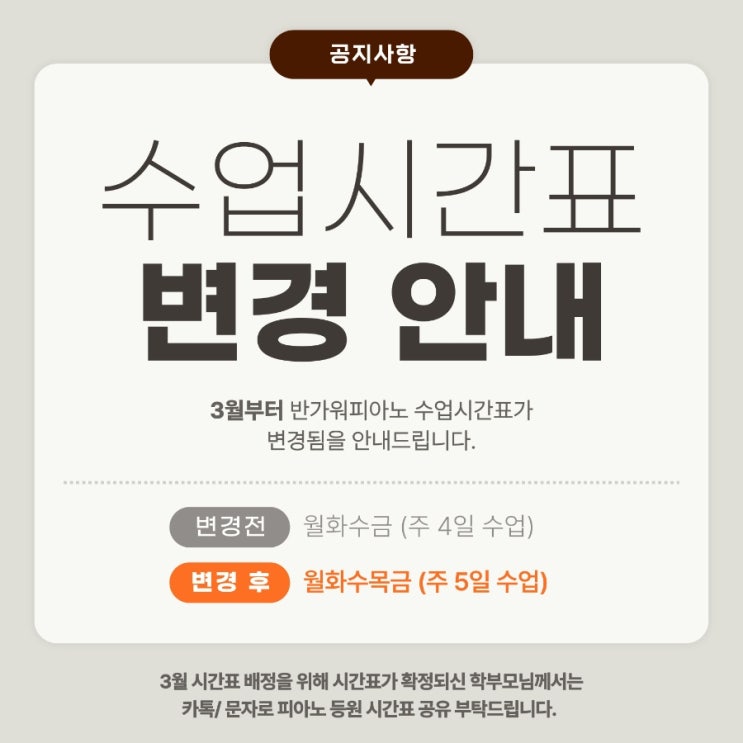 학원 수업시간표 변경 안내 그동안 특정 요일에 수업이 몰려 대기하셨던 분들, 시간 맞추기 어려우셨던 학부모님들께 소식을 전해드립니다 3월부터 저희 원은 주5일 운영으로 변경됩니다. * 아이들의 개개인 수업권 보장을 위해 3월부터는 철저한 시간정원제 수업으로 진행됩니다. 더욱 쾌적하고 집중력 있는 연습 환경 조성을 위해 학부모님들의 협조를 부탁드립니다 3월 시간표 배정을 위해 확정된 스케줄을 카톡이나 문자로 공유 부탁드립니다. 모든 상담은 예약제로 운영됩니다. 010-2946-0613 청학로92번길 29 스카이빌 1층 (별내초 도보 2분) 별내/청학리 프리미엄 음악교육 반가워 피아노 ▫....... <img src="https://blogthumb.pstatic.net/MjAyNjAyMTFfMTI5/MDAxNzcwNzg2OTU5NjU4.93F_XuoiKLD_QwiOoADyhxV3WC2tiVoe_0yDqef7tMkg.Cl8vabZ6rOqfCSGUITNEuhrqO21vPy30X7c1GV34R4Ag.JPEG/900%A3%DF1770784261937.jpg?type=s3" />