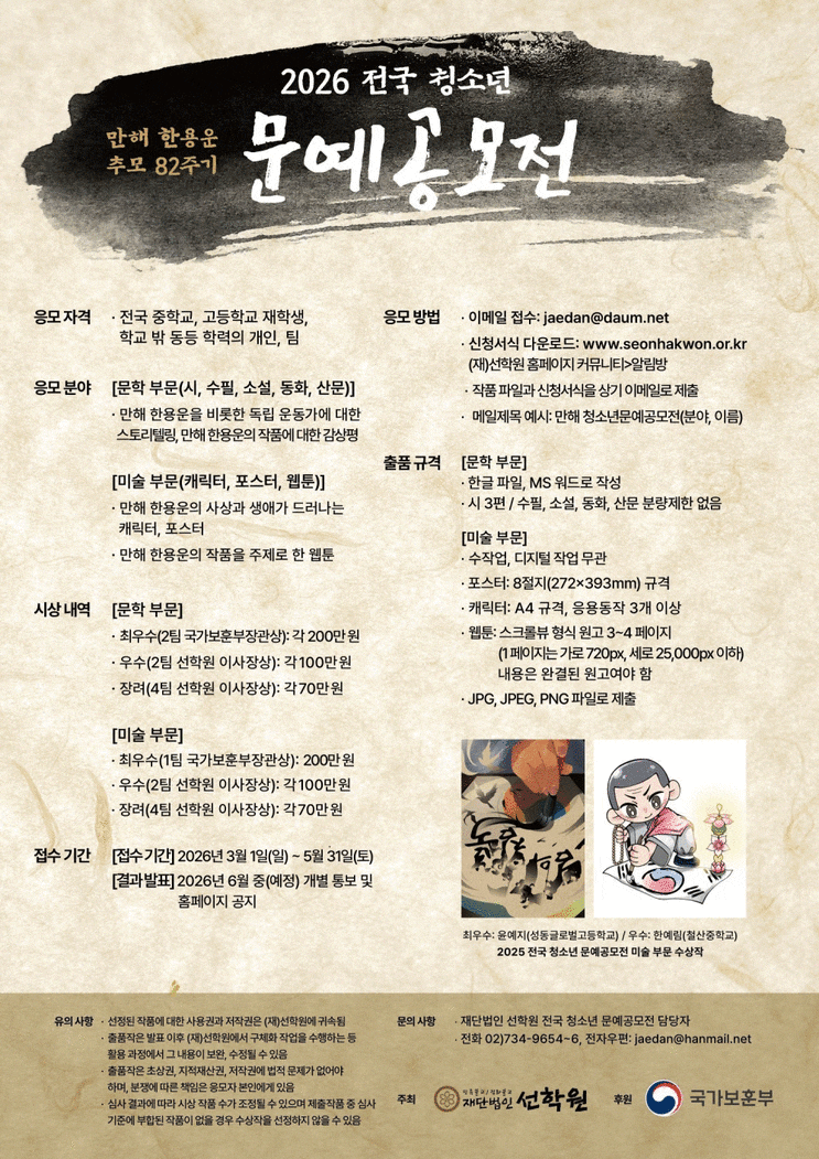 만해 한용운선생 추모 82주기 2026년 전국 청소년 문예공모전 ◎ 응모 자격 전국 중학교 및 고등학교 재학생, 학교밖 동등 학력의 개인, 팀 ◎ 응모 분야 및 주제 [문학 부문] 시, 수필, 소설, 동화. 산문. - 만해 한용운 선생을 비롯한 독립운동가에 대한 스토리텔링. - 만해 한용운 선생의 작품에 대한 감상평. [미술 부문 ] 캐릭터, 포스터, 웹툰. - 만해 한용운 선생의 사상과 생애가 드러나는 포스터, 캐릭터. - 만해 한용운 선생의 작품을 주제로 한 웹툰.. ◎ 시상 내역 [문학 부문] - 최우수상 (2명<팀>, 국가보훈부장관상) : 각200만원 - 우수상 (2명<팀>, 선학원 이사장상) : 각100만원 - 장려상 (4명<팀>, 선학원 이....... <img src="https://blogthumb.pstatic.net/MjAyNjAzMDFfMTYy/MDAxNzcyMzY5Mjg5NzMx.abRw6dWFb7YWzmLfNnRKUIq2i50Dfmr40f-NZSkRZmEg.w-a-6WPxSSDPeKoPAejZPLj8thSPnvZecxWebE1ItZIg.GIF/01.gif?type=s3" />