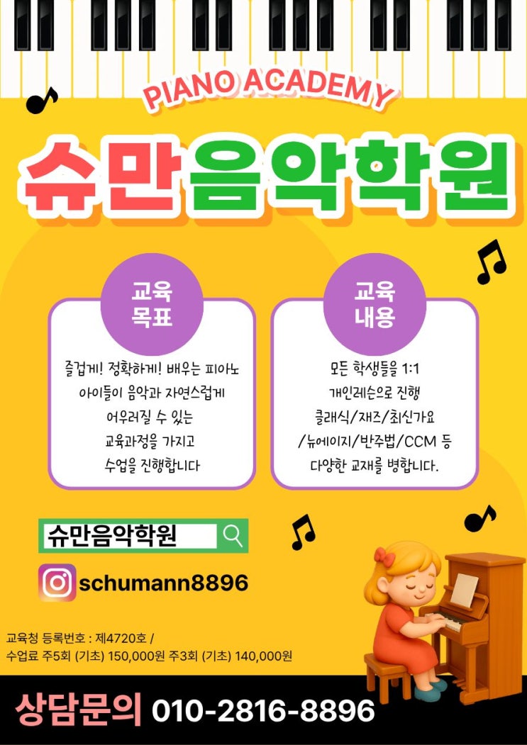 안녕하세요 사랑이 가득한 슈만음악학원입니다 :) 아이의 첫 음악, 제대로 시작하는곳 아이의 가능성을 키워주는 슈만음악학원입니다. 요즘 많은 부모님들께서 "우리 아이, 피아노 언제부터 시작하면 좋을까요?" 라는 질문을 많이 주시는데요, 음악은 단순한 취미를 넘어 아이의 집중력,표현력,자신감까지 함께 성장시키는 중요한 교육입니다. 슈만음악학원이 특별한 이유 * 1:1 맞춤 레슨 아이의 성향과 수준을 고려한 개별 커리큘럼으로 처음 시작하는 아이도 부담없이 즐겁게 배울 수 있어요. * 기초부터 탄탄하게 손 모양, 리듬, 악보읽기 까지 대충이 아닌 정확한 기본기를 잡아드립니다. * 즐거운 수업 분위기 억지로 시키는 음....... <img src="https://blogthumb.pstatic.net/MjAyNjAzMThfMjg1/MDAxNzczODMzNzc2NTA2.aPMXgR0wzRhj7MQFi_szNPSb1aOffOf1OgG17rPuv2gg.NxltH4_U8DRXhFMDcYDOYAG7yESuKAfyQ-F_pTYC6B0g.JPEG/%C7%D0%BF%F8%C0%FC%B4%DC%C1%F6.jpg?type=s3" />
