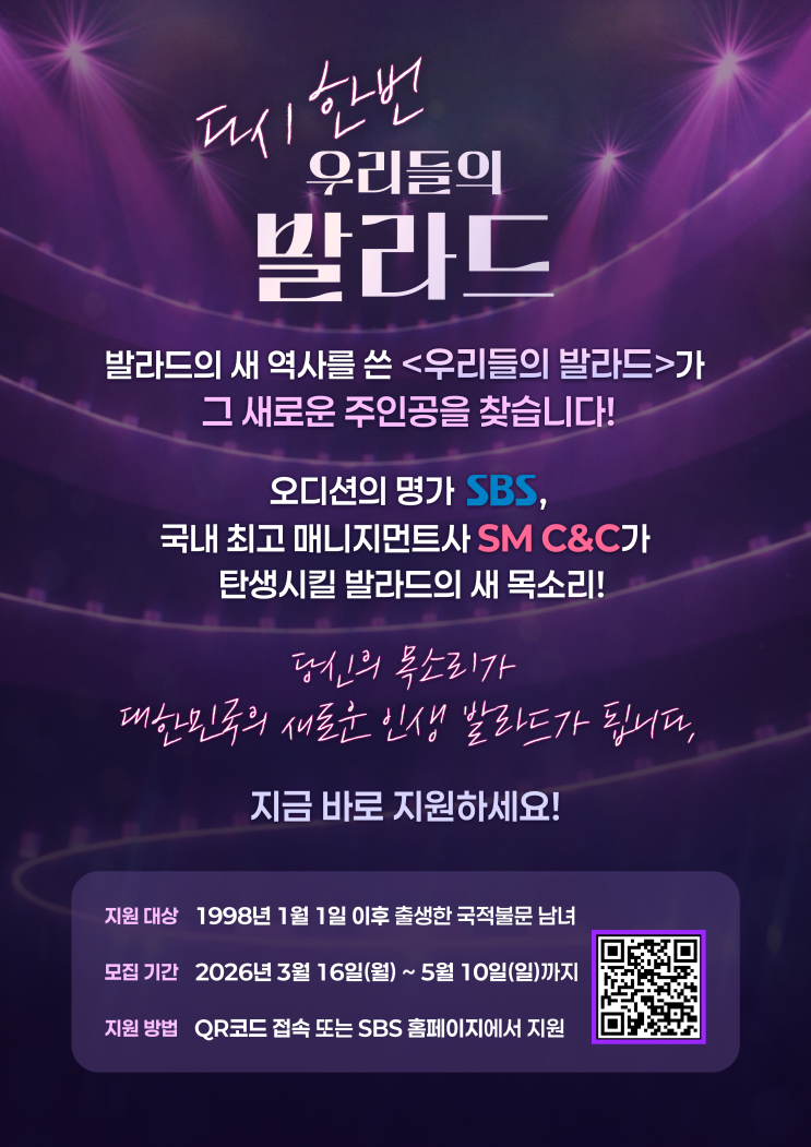 안녕하세요! 미사 천호 림실용음악학원입니다! 바로 오디션의 명가 SBS 와 국내 최고 매니지먼트사 SM C&C 가 함께하는 <우리들의 발라드> 시즌2 소식입니다!! 목소리로 마음을 흔드는 발라드 가수가 되고 싶다면, 이번 기회를 절대 놓치지 마세요! 어떻게 지원하면 될까요? <지원안내> 지원 대상 : 1998년 1월 1일 이후 출생한 국적불문 남녀 모집 기간 : ~ 5월 10일(일)까지 지원 방법 : QR코드 접속 또는 SBS 홈페이지에서 지원 ▼ ▼ 입시의 완성, 림실용음악학원 [실용음악과 입시 보컬 기타 베이스 드럼 피아노 미디 작곡 싱어송 음향 전문 학원] 을 선택해야 하는 이유! 1. 14년의 노하우로 체계적인 커리큘럼 제공 2. 실....... <img src="https://blogthumb.pstatic.net/MjAyNjAzMjdfMjQg/MDAxNzc0NTkyNjI2NjQx.qAdaIFIEII_8lLL33sqxzQiYjqKWifOGufGHGPPPYeUg.8Wlj-lD6Y1B_ylNn6jK46ssr2Myr5x0d8ARExIFkg04g.PNG/%BF%EC%B8%AE%B5%E9%C0%C7%B9%DF%B6%F3%B5%E52_%B0%F8%B0%ED%B9%AE_%28KOR%29.png?type=s3" />