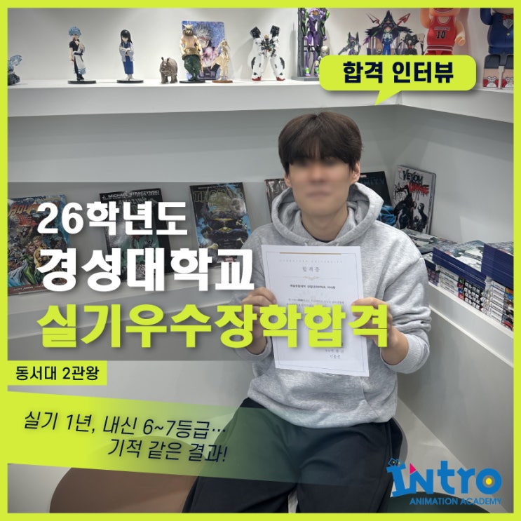 내신 6~7등급도 장학합격 가능했던 이유|경성대 실기우수장학 합격인터뷰|사하 인트로만화학원 안녕하세요. 부산 사하 인트로만화학원입니다. 오늘은 기쁜 소식과 함께 2026학년도 수시 전형 결과를 공유드리려고 합니다. 끝까지 최선을 다해준 학생의 값진 결과, 함께 확인해 주세요. 오늘 포스팅에서는 이O후 학생의 합격 인터뷰를 소개해드릴게요. 이번 합격은 ‘운이 좋았다’로 설명할 수 없는 이야기예요. 내신 6~7등급에서 시작했지만, 실기 1년을 온전히 쏟아부어 기본기를 다시 세우고 매일의 연습으로 빈틈을 메우며 결국 결과를 바꿔냈습니다. 낮은 내신을 넘어설 만큼 단단해진 실력과, 끝까지 버틴 시간이 만들어낸 값진 반전이라....... <img src="https://blogthumb.pstatic.net/MjAyNjAyMDJfMjAw/MDAxNzcwMDEyMDEzNzkw.hcMBXiVEHXcyaonr1ioqGbQH_jHtl6AHefOREVytPWUg.j_SiWQ0A5iTj_B00AC9DrcmtKsTuYWkmhjU7rEERaSog.JPEG/5.jpg?type=s3" />