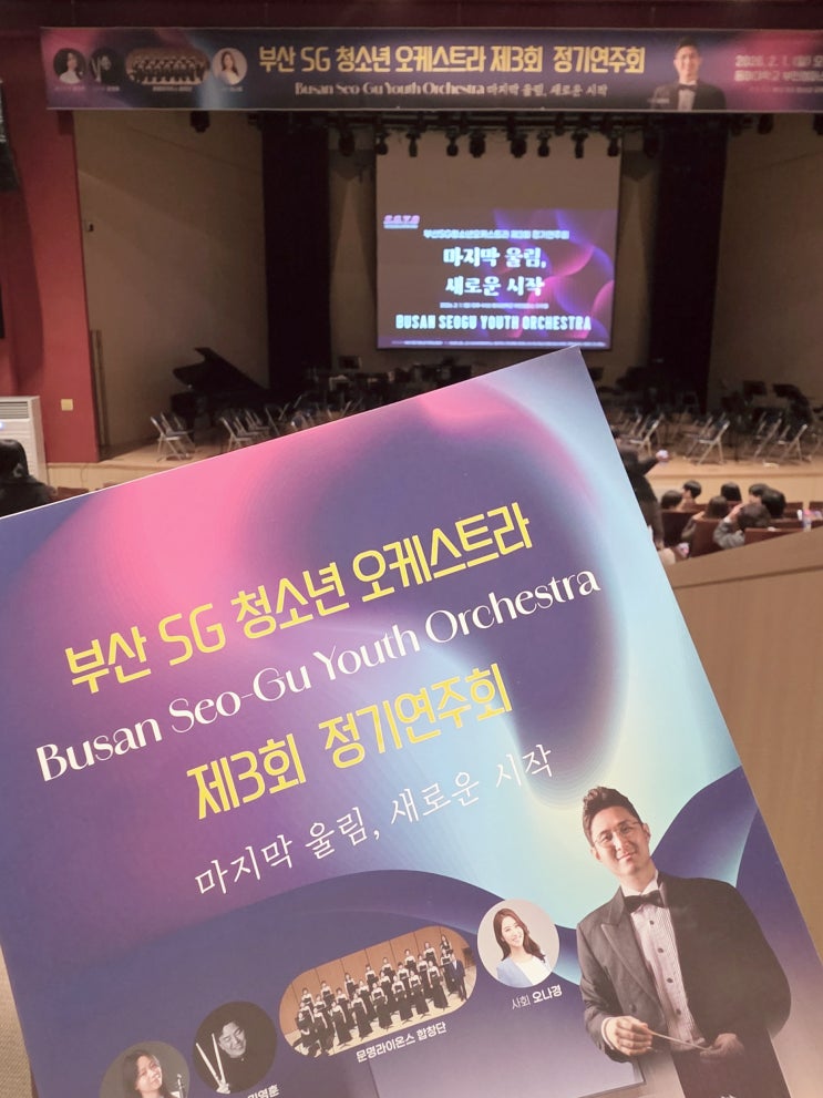 안녕하세요! 다정한 레미쌤입니다. 지난 주말, 다들 어떻게 보내셨나요? 저는 지난 일요일(2월 1일), 레슨실이 아닌 탁 트인 공연장으로 '출동'을 했습니다. 학원 밖에서도 음악과 함께 성장하고 있는 우리 기특한 제자들을 응원하기 위해서였죠! 바로 <부산 SG 청소년 오케스트라 제3회 정기연주회>가 있었던 날이었거든요. 단순히 제자가 나와서가 아니라, 이번 연주회가 가진 의미가 참 특별했는데요. 가슴 뭉클하고, 또 한편으론 어깨가 으쓱했던 그 현장! 레미쌤의 시선으로 꼼꼼하게 담아왔습니다. 함께 보실까요? 휘비고~! ♀️ 마지막 울림, 그리고 새로운 시작 장소는 동아대학교 부민캠퍼스 다....... <img src="https://blogthumb.pstatic.net/MjAyNjAyMDNfMjk4/MDAxNzcwMDg2MzcxMzEy.ZYnU3qb6mAbjADQVgNdRjeRm84n-Y0OcsFLDECDHgygg.zupMrpvtqxfCVodiA2uUuydLyn1a9aQYvsdNO2UpR7Qg.JPEG/KakaoTalk_20260203_072304103.jpg?type=s3" />