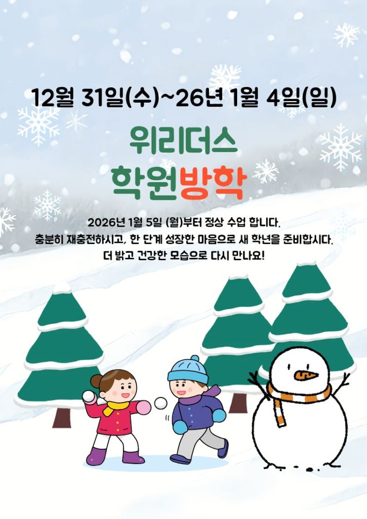 안녕하세요 위리더스입니다 ~^^ 오늘은 학원 방학기간 안내 공지입니다 !! 기존의 위리더스학원 방학은 항상 연말(12월 31일) 하루 고정이었습니다. 하지만 !! 이번 학원 방학은 1월2일(금) 까지 포함한 약 5일간의 긴 방학이 시작됩니다. 방학은 학기를 마무리하고 쉬어가는 의미이기도 하면서 다음을 준비하기위한 기다림이라고도 할 수 있습니다. 방학이 끝나고 나서 약 일주일의 시간을 가진 후, 방학특강이 시작되오니 이번 연휴를 이용하여 휴식을 충분히 취할 수 있으면 좋겠습니다. 감사합니다. 인연을 소중히 여기는 학원 위리더스입니다. #당하동 #학원 #초등 #중등 #수학 #영어 #당하동학원 #당하초 #백석초 #완정초 #한들초 #당하중....... <img src="https://blogthumb.pstatic.net/MjAyNTEyMjRfOSAg/MDAxNzY2NTc4OTczMzE2.GLo-0o5iM9wl0W1NyiIgKFA-kq2-BUOMO73E2pB5BDcg.F7GIkNrA5-3LvyA-XbI1d4jH7PDciHbQUx7Zfo8oP5Ug.JPEG/%C1%A6%B8%F1%C0%BB_%C0%D4%B7%C2%C7%D8%C1%D6%BC%BC%BF%E4._%284%29.jpg?type=s3" />