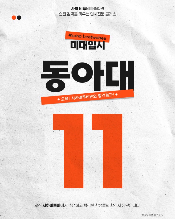 안녕하세요 사하비투비미술학원입니다 ・ᴗ・ 오늘은 정말 기분 좋은 소식과 함께 찾아왔습니다 ! 무려 올해 동아대학교 11명 합격 학생들이 얼마나 열심히 준비했는지, 그 결과가 이렇게 멋지게 나와서 뿌듯합니다 ! 지금부터 그 합격을 만들어낸 리얼 합격작 일부만 공개해볼게요 ~ 2026 동아대학교 합격작 와... 이 작품은 보자마자 눈이 확! 가는 그림이죠 ~ 강렬한 붉은 색감의 랍스터가 화면 중심을 꽉 잡아주면서 유리컵과 물의 움직임이 함께 어우러져 굉장히 역동적인 장면을 만들어내고 있네요 ・ᴗ・ 특히 집게를 크게 강조한 구도 덕분에 화면이 앞으로 튀어나오는 듯한 입체감과 긴장감이 살아있고, 물 튀김 표현과 유리 질감....... <img src="https://blogthumb.pstatic.net/MjAyNjAzMThfNjYg/MDAxNzczODIwMzUyNTAx.lvFC94cJzkiq8kj0SiG96WxawzOjNUiHQf2leVtX6Fwg.LUifPdWRSJtKHkwHNhrfLk4nE0c21T6VSlG8Ev-p5uAg.JPEG/%B5%BF%BE%C6%B4%EB1.jpg?type=s3" />