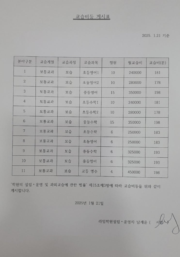 라임학원 교육비