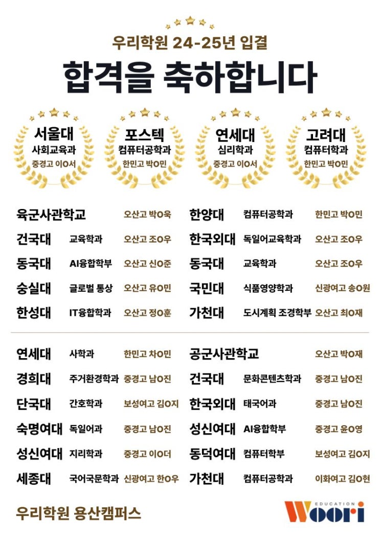 [용산 동빙고동 한남동 이태원 이촌동 성동구 초중고 국영수 학원] 우리학원 2025 입결 서울대, 포스텍, 연세대, 고려대 최종합격