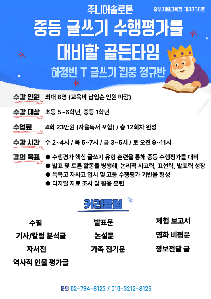 [주니어솔로몬] 하정빈 선생님 중등 수행평가 글쓰기 3월 개강 **수강료 할인 혜택**