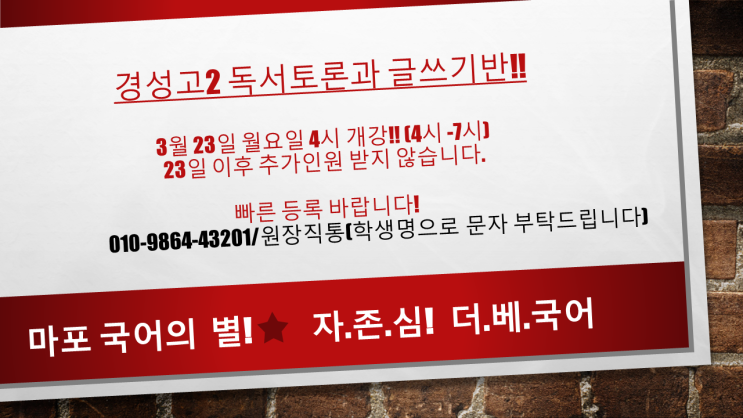 (02201900083호) 경성고2 독서토론과 글쓰기 쉬운 줄 알고 선택했는데!!!! 까아아아암짝 놀랐죠?? 주변 학원 원장 아들, 딸은 국어는 어디서??? 원장이 네이버인물검색에 나오는 마포 유일 의 강사가 있는!! 바로 더베스트 국어!!!! 박상현 원장(48/네이버검색: 티제이박 또는 박상현) 홍익대학교사범대학부속여자고등학교 경성고등학교 이제!! 제발!! 국어는!! 검! 증! 된!! 거짓없는!! 21년 경력!! 마포 유일!!! 네이버 인물검색에 등재되어있는 원장이 직접 지도하는!! (일부반 제외/티제이박/박상현) 마포 최정상 국어전문 학원에서!!!! ⚡⚡모든 반 원비:28만원 (교재 제공)⚡⚡ ✨✨경성고 2학년 시간표✨✨ ✨1. 월요일 오....... <img src="https://blogthumb.pstatic.net/MjAyNjAzMTVfMjc4/MDAxNzczNTQzODczMDk1.2rmsDmNOyGj1dioriMYsTbEXes8G5remkxqU9XZMvcMg.DiPHg2n38luZcmhL88aI98VYevdYcHdmaxbaf5MqWVEg.PNG/%BD%BD%B6%F3%C0%CC%B5%E54.PNG?type=s3" />