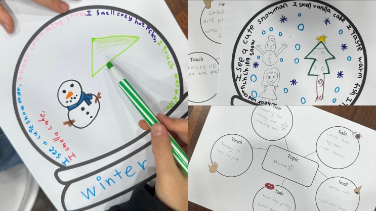 This week, we introduced English creative writing to our third-grade class. They each had to come up with a winter sensory poem using the tools we had already provided them with. Before writing, we planned and drafted our poems using a simple mind map. Using the five senses as a guide, they noted words and short sentences about what winter looks like, feels like, and sounds like. After organizing their thoughts & choosing vocabulary more carefully, they began to describe, in short lines, what winter means to them. x Writing their poetry in a snow globe was an awesome idea, as it truly enca....... <img src="https://blogthumb.pstatic.net/MjAyNjAxMjlfOTcg/MDAxNzY5Njc5MDU0NzM0.xHltpd7EgbsemnoflEU7gGv1o4H9l0kcErRIggL5G7sg.vEEdaY8Bfl0HCnqM8nUnc_iWQl6AP_GUh_Nfmba5AEog.JPEG/KakaoTalk_20260129_183034190.jpg?type=s3" />