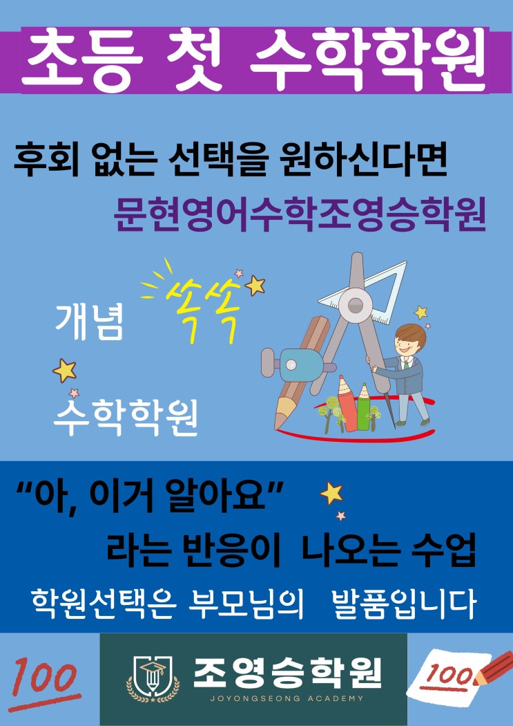 안녕하세요. 문현영어수학조영승학원입니다. 단순히 연산을 빨리 시키는 학원이 아닙니다. 아이에게 ★ 어떻게 배워야 오래 기억되는지 ★ 중·고등까지 어떻게 이어지는지 ★ 학생 한 명, 한 명을 위한 1:1 맞춤 수업 문현조영승학원은 모든 수업이 학생 개인 중심으로 진행됩니다. ♥ 학생마다 진도 다름 ♥ 학생마다 교재 다름 ♥ 학생마다 설명 방식 다름 같은 학년이라고 같은 수업을 하지 않습니다. 아이의 이해 속도, 사고력, 성향을 분석해 그 아이에게 맞는 수업만 진행합니다. ※ 초등 수학이 중·고등으로 이어진다는 걸 ‘보여주는 수업’ “이거 왜 배워요?” 아이들이 가장 많이 묻는 질문입니다. 문현조영승학원에서는 초등에서 배....... <img src="https://blogthumb.pstatic.net/MjAyNjAxMjdfOTMg/MDAxNzY5NTAxMjg2MDc3.XCB1mTuYw98p4kdHduFKP_NoR8kw6Ca5mJIfsDxBBxYg.-QwFPxHj30IDTAp3wId17ZsWoasHBYEjetAYq8FcC5Ug.JPEG/%BB%E7%BA%BB_-%C1%A6%B8%F1%C0%BB_%C0%D4%B7%C2%C7%D8%C1%D6%BC%BC%BF%E4._%281%29.jpg?type=s3" />