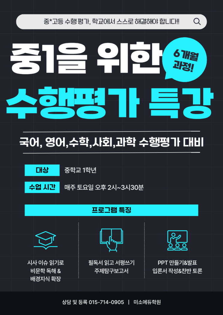 새학년, 새학기의 시작으로 설레면서도 우왕좌왕 하게 되는 시기입니다. 특히 중학교에 갓 입학한 우리 아이들... 걱정 많으시죠.. 2022 개정교육과정으로 수행평가가 더욱 중요했다는 사실, 과제형 수행 평가가 아닌 현장형 수행 평가가 대부분이라는 사실, 책과 연계한 수행 평가가 전과목에 걸쳐 존재한다는 사실~!!! 정말 중요한 사실들입니다. 그래서!!! 미소에듀학원에서는 중1을 위한 수행평가대비 특강을 개강합니다. 지난 겨울방학에는 중등부 전 학년을 대상으로 수업을 진행했었는데, 반응이 뜨거웠습니다. 그 중 몇 개의 후기를 보여드리면~ 생각하는 힘이 자라고, 토론과 발표를 두려워하지 않으며, 자신감이 생기고 스스로 해낼 수....... <img src="https://blogthumb.pstatic.net/MjAyNjAzMDdfMTQy/MDAxNzcyODY1MDc3NTIz.Sqb-PgVKbVIYOk3Bhf3bLdKwnlJz2nUvfw8k_1Py1Hcg.iOuUS-bFq8fqJjF0c2olRNWIkKDbhYjIjXiPrQy6fCUg.PNG/%C1%A6%B8%F1%C0%BB_%C0%D4%B7%C2%C7%D8%C1%D6%BC%BC%BF%E4._%286%29.png?type=s3" />