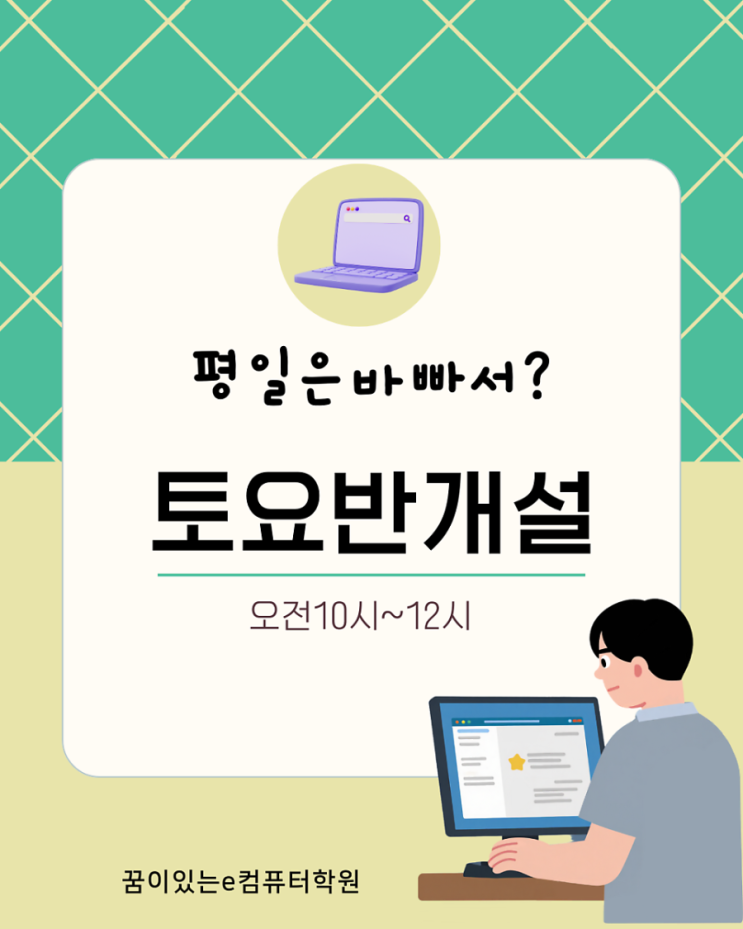 평일에는 시간이 부족했던 분들을 위해 3월 토요반 수시 개강중 입니다. ☆ 이런 분들께 추천드립니다☆ ✔ 평일 퇴근 후 학습이 어려운 직장인 ✔ 평일 다른 학원스케줄로 도저히 시간이 없는 학생 ✔ 자격증 취득을 목표로 단기간 집중하고 싶은 분 ✔ 컴퓨터 기초부터 실무까지 체계적으로 배우고 싶은 분 ✔ 나만의 속도에 맞춰 배우고 싶은 성인 및 기초 학습자 토요반 수업 안내 ✔ 매주 토요일 운영 ✔ 오전 / 오후 시간 선택 가능 ✔ 소수정예 맞춤형 수업 진행 ✔ 개별 진도 & 1:1 피드백 제공 ◆ 교육 과정 (선택 가능) ✔ 컴퓨터 기초 (한글, 인터넷 활용) ✔ 컴퓨터활용능력 자격증 과정 ✔ ITQ 자격증 과정 ✔ 엑셀 / 파워....... <img src="https://blogthumb.pstatic.net/MjAyNjAyMjdfOTQg/MDAxNzcyMTQxMDMxNTQw.4VeqCSqP0J1CuhEzQQ-BXCfhxmQ1ZO4NBUA7aHNGH7og._1bvlSAmwduwlsqRq4cT6GShge7EqS2tm6kgISDTzVsg.PNG/900%A3%DF1772140927201.png?type=s3" />