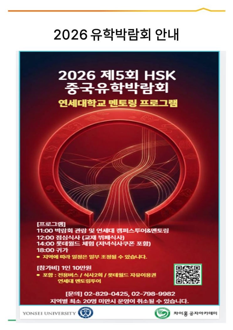 안녕하세요! #차이홍 명지국제중국어 교습소입니다! 중국 유학을 고민하고 계신 학생, 학부모님께 꼭 필요한 정보를 한 자리에서 확인할 수있는 기회입니다~ 제5회 hsk 중국유학박람회 연세대학교 멘토링 프로그램 동시 진행! hsk3.0안내 행사일정:5월 23일 토요일(연세대 신촌캠퍼스) 서면집결:버스출발 20명이상 버스 운영 참가비:1인 10만원 포함내역:점심식사,롯데월드 자유이용권,멘토링,석식(도시락),왕복 버스비 참여대학:20개 이상,북경대 청화대 절강대 복단대 등등 추천학생:중국 유학을 고민 중인 학생,정확한 유학 정보를 알고 싶은 학부모님,대학별 입학정보 상담을 직접 받고싶은분! 학생 학부모 동반참여가능! 친구도 같이 참여가....... <img src="https://blogthumb.pstatic.net/MjAyNjAzMjZfMTc0/MDAxNzc0NTAwODM3NDg2.cZ60MdF3LA9Os1pxwp0fl94hgG1CEVM-Ju9lrQid_Kog.mCSdTUVjNzZgjm7TLW7tfbBga4zWS3TodT7zI9GfLtUg.JPEG/%BD%BD%B6%F3%C0%CC%B5%E52.JPG?type=s3" />