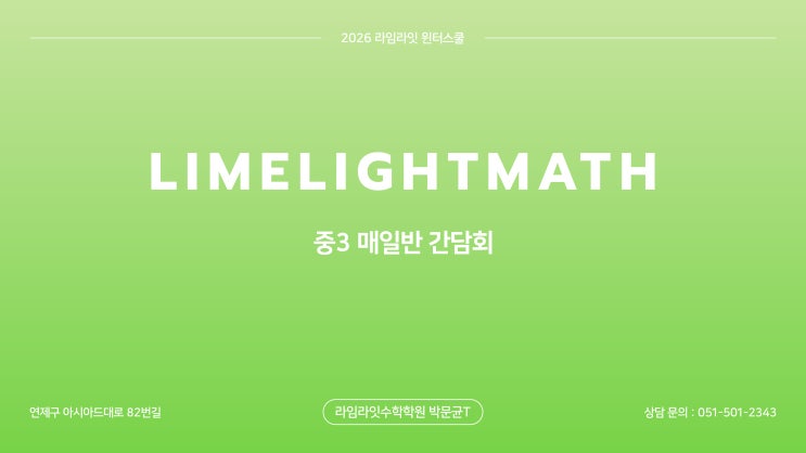 안녕하세요! 사직동 수학학원 라임라잇 문균T입니다. 이번 방학에도 예비중3 학생들을 위한 중3 수학 매일반을 개설합니다. 중3이 되기 전, 방학 동안 탄탄하게 기초를 잡고 싶은 학생들에게 최적의 과정입니다. 간담회 일정 12/20(토) 16:00-17:00 수업 과정 설명 및 질의응답 장소는 참석 인원에 따라 조정되며, 확정 후 별도 안내드립니다. 사직동 간담회 빠르게 신청하기 중요한 건 꺾이지 않는 마음입니다. 문균T 더 알아보고 싶다면? 특강 일정 및 구성 기간 : 방학 기간 월~금(주 5회) 시간 : 15:00 – 16:30 클리닉 : 16:30–18:00 권장 (일정이 있을 시, 13:30-15:00 가능) 90분 본 수업 후 90분의 클리닉....... <img src="https://blogthumb.pstatic.net/MjAyNTEyMTBfMjQ1/MDAxNzY1MzUxOTkxNzkx._V8r-3-0QcDLz0I6pTStZ4D8s1AefqjVUmaztbhNKdcg.dMPK8fKWoJ4sE1IGlJ3m94_WPXzm8HpONabxjlboauAg.JPEG/1206_%C0%A9%C5%CD%C8%AB%BA%B8-01.jpg?type=s3" />