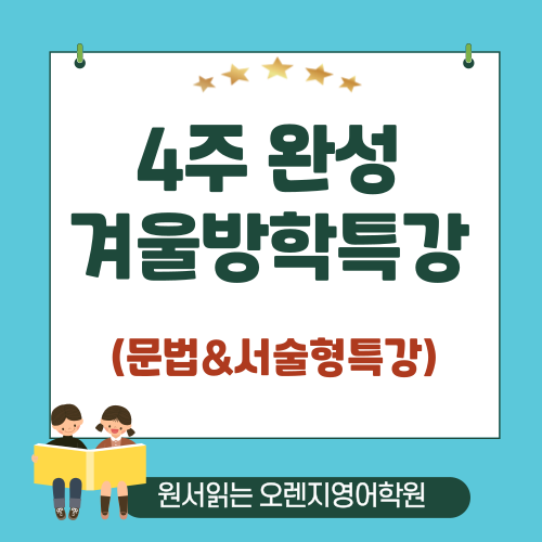 안녕하세요. 원서읽는 오렌지영어학원장 입니다. 아이들이 중등 과정에 들어가면, 지금까지 꾸준히 쌓아온 원서 읽기 실력을 바탕으로 내신 시험, 문법, 서술형까지 함께 관리해야 하는 시기를 맞이하게 됩니다. 그래서 오렌지영어는 원서 읽기를 중심에 두되, 읽는 영어에 머무르지 않고 내신과 문법을 반드시 함께 관리합니다. 특히 중등 과정으로 넘어가면서 많은 아이들이 문법 개념은 알고 있지만 서술형에서 점수를 놓치는 어려움을 겪게 됩니다. 겨울방학은 짧지만, 이런 약점을 정확히 짚고 영어 실력을 한 단계 끌어올릴 수 있는 가장 중요한 시기이기도 합니다. 그래서 오렌지영어에서는 2026년 겨울방학, 4주 완성 문법 & 서술형....... <img src="https://blogthumb.pstatic.net/MjAyNTEyMThfMTk4/MDAxNzY2MDUxOTAwNjIy.16X3m0QOFtlh1IGoGrlxFFoa5aRe8bVppPeb4Qjg3Psg.Pwcgqw0DvNb5NhAm7iV5TtoZwBnjog_ubFVwcwl9Zzsg.PNG/%B1%B3%C0%B0%B0%FA%C1%A4-006.png?type=s3" />