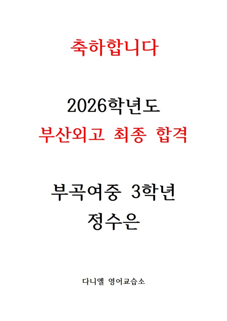 2026학년도 특목고·자사고·과학고 합격자 발표가 있었습니다. 사직동 수학학원 라임라잇수학학원에서 꾸준히 학습을 이어온 학생들이 각자의 자리에서 좋은 결과를 만들어냈습니다. 결과로 증명해 준 학생들, 진심으로 축하합니다. 부산일과고 내성중3 최O서 포항제철고 연일중3 김O은 연일중3 김O주 여명중3 배O찬 김천고 여명중3 김O현 부산외고 국제중3 이O영 부곡여중3 김O은 여명중3 이O환 현대청운고 여명중3 최O민 지금의 선택이 고등 3년을 좌우합니다. 라임라잇은 결과로 검증된 학습으로 다음 합격을 준비합니다. 상담 및 문의 평일 9:00~22:00 (방학 중) 주말 9:00~21:00 사직동 라임라잇수학학원 본관 051-501-2343 초중등....... <img src="https://blogthumb.pstatic.net/MjAyNjAxMDZfMjUz/MDAxNzY3Njg2NTQ0NzE3._NH6nt2RtEEVCUyNAp6s9tPmhgiqLWT9-7zIlWsYvNQg.lhjobHhtS-YA1xeGY2pb9FM92YF2sKsW8o3DylLajfgg.JPEG/%C7%D5%B0%DD_%BE%C6%C6%AE%BA%B8%B5%E5_8.jpg?type=s3" />