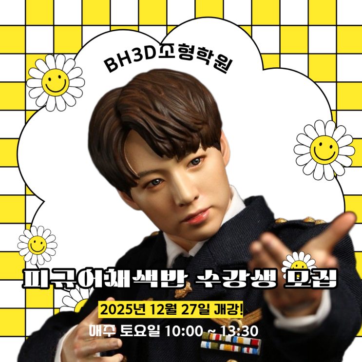 안녕하세요! BH3D조형학원입니다. 2025년이 벌써 끝을 향해 달려가고 있죠. 내 마음속에 최애캐 하나쯤은 품고 있는 분들이라면 피규어를 보면서 뭔가...뭔가 더 예쁘게 만들고 싶어!!! 라는 생각을 해보셨을거예요. 에어브러시의 부드러운 명암, 세필붓으로 완성하는 미세한 디테일, 피부톤과 질감 표현에서 생기는 ‘프로 느낌’— 이 피규어, 내가 집도한다. 에어브러쉬. 라는 생각으로 도색에 본격적으로 빠져들고 싶어지기도 하죠! 이런 생각 한 번이라도 하셨다면, 바로 지금이 기회예요! 12월 27일 토요일, 피규어 채색반 드디어 개강! 올해 마지막으로, 나만의 피규어 채색을 확실히 업그레이드할 수 있는 시간입니다. 이....... <img src="https://blogthumb.pstatic.net/MjAyNTEyMDhfOSAg/MDAxNzY1MTYxOTQwMzA5.mrARk59R9RJkfrulakc_POptZKZCLvlQZxX-GK5xCngg.bAPePKyCbnt54Q9d3YFUObipkzoWon-OX-S7uJa4EZQg.PNG/%C7%C7%B1%D4%BE%EE%C3%A4%BB%F6%2C%C7%C7%B1%D4%BE%EE%B5%B5%BB%F6%2C%BF%A1%BE%EE%BA%EA%B7%AF%BD%AC%2C%BC%BC%C7%CA%BA%D7%2C%C7%C7%BA%CE%C1%FA%B0%A8%2C%C7%C7%BA%CE%C7%A5%C7%F6%2C%BE%C8%B1%B8%C7%A5%C7%F6%2C%C5%F5%B8%ED%C7%C7%BA%CE%2C%BC%F6%C3%A4%BA%D7%2C%BD%C7%BB%E7%C7%C7%BA%CE%2C%C1%D6%B8%BB%B9%DD%2C%C5%E4%BF%E4%C0%CF%B9%DD%2C%BC%BA%BC%F6%B5%BF_%282%29.png?type=s3" />