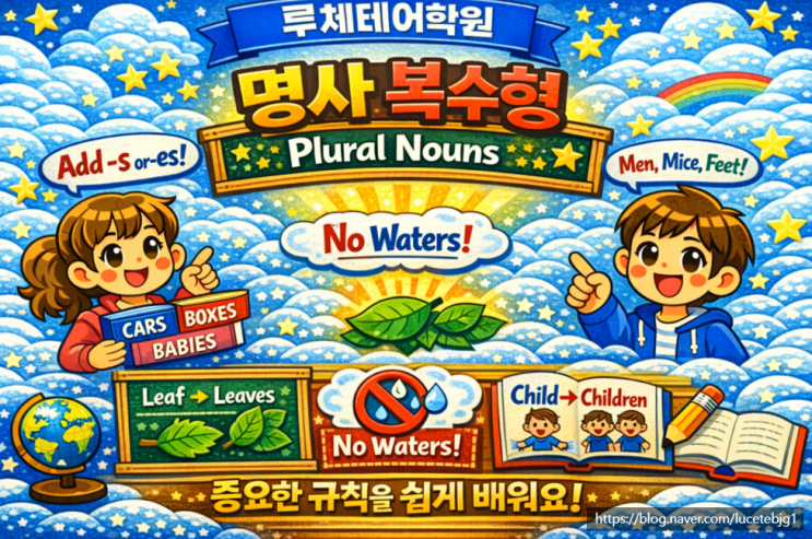 안녕하세요~ 정관 루체테입니다. 영어에서 명사의 복수형, 생각보다 어렵지 않아요! 영어를 공부하다 보면 가장 먼저 배우는 문법 중 하나가 바로 명사의 복수형입니다. 처음에는 단순히 “하나면 단수, 두 개 이상이면 복수!”라고 생각할 수 있지만, 실제로는 조금 더 다양한 규칙이 있어요. 오늘은 영어 명사의 복수형을 쉽고 간단하게 정리해보겠습니다. 명사 복수의 기본 규칙 먼저 알려드리겠습니다. 즉, 하나의 책은 a book, 두 권 이상의 책은 books가 되는 거예요. 이 규칙이 가장 많이 쓰이기 때문에 먼저 익혀두면 좋습니다. 모든 명사에 무조건 -s만 붙는 것은 아닙니다. 어떤 단어들은 발음을 더 자연스럽게 하기 위해 -es를 붙입니....... <img src="https://blogthumb.pstatic.net/MjAyNjA0MDFfMjEx/MDAxNzc1MDMzOTE4MTUz.P9gQ1UPKvTJ_TWi4ufAB4UqlTRxskMU1EuErmaf4As4g.wzyB1YZGn6qkfYQ1VBDL0_UTPAFSGt5iGHW5YRhOF1gg.PNG/h.PNG?type=s3" />