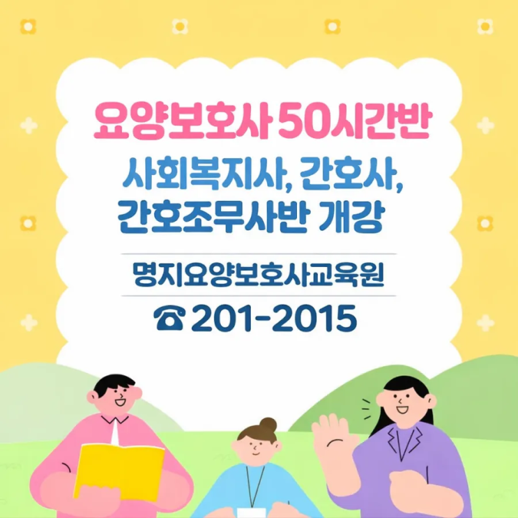 #명지요양보호사교육원5월초개강사회복지사간호사간호조무사반 은퇴없는 요양보호사, 5월반 개강예정입니다~ 4월20일부터 개강안내드립니다~ ● 주간반 사회복지사 간호사 간호조무사 면허증/자격증 소지자를 위한 반~ 50시간 공부합니다. 7일 종일 수업 + 1일 요양원 실습. ■야간반 사회복지사 간호사 간호조무사 면허증/자격증 있는 분을 위한 반~ 50시간 공부합니다. 금요일 밤 6시~밤 10시 4회 토요일 오후1시~밤 10시 4회 (평일 하루, 요양원 8시간 실습합니다.) ※50시간 과정을 마친 후 부경대학교 용당캠퍼스에서 컴퓨터 시험응시~ 시험을 위해 아래 첫번째 영상 미리 세번씩 듣고 수업 참가 요망합니다~ 부탁드려요! ※4월20일부터 등....... <img src="https://blogthumb.pstatic.net/MjAyNjA0MDNfMTY0/MDAxNzc1MTk0OTkxODgw.4wixZsPEfetQfd2F4uJTGNk8dDEXqmZ5G8YbmZOL8s4g.aEb7u0-2AZrfB4JlOhQHtQbM4QdR8CR_dpPMNA6c1HUg.PNG/900%A3%DFfile%A3%DF000000003c14720998a64511453ee9cf.png?type=s3" />