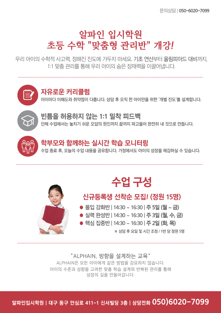 안녕하세요? 방향을 설계하는 교육, 알파인 입시학원입니다. 감사하게도 그동안 중등부와 고등부 수학 수업이 전 타임 마감되어 초등부 개설에 대한 학부모님들의 꾸준한 요청이 있었습니다. 중고등학생들의 성적 향상을 이끌어온 검증된 학습 시스템을 바탕으로, 마침내 초등 수학 개별 맞춤반을 공식적으로 개설하게 되었습니다. 신서동 수학학원 초등 수학, 왜 '맞춤형'이어야? 많은 학부모님이 "초등 수학은 연산만 잘하면 되는 것 아닌가요?"라고 묻습니다. 하지만 중·고등 수학 현장에서 학생들을 가르치다 보면, 고등 수학에서 무너지는 이유가 초등 시기의 잘못된 습관과 구멍 난 개념에 있다는 것을 매번 확인하게....... <img src="https://blogthumb.pstatic.net/MjAyNjAxMDlfMjgx/MDAxNzY3ODk2MzQ4MjI0.30QgQj7dMz-xBcmeCTCPdEWJpEqZKMAV7mR0Z5yW44kg.exvHQoAOvEdsscBbmVQM60sCEWuDPK6ghWGNPnxDdEkg.PNG/%BE%CB%C6%C4%C0%CE_%C3%CA%B5%EE_%BC%F6%C7%D0.png?type=s3" />